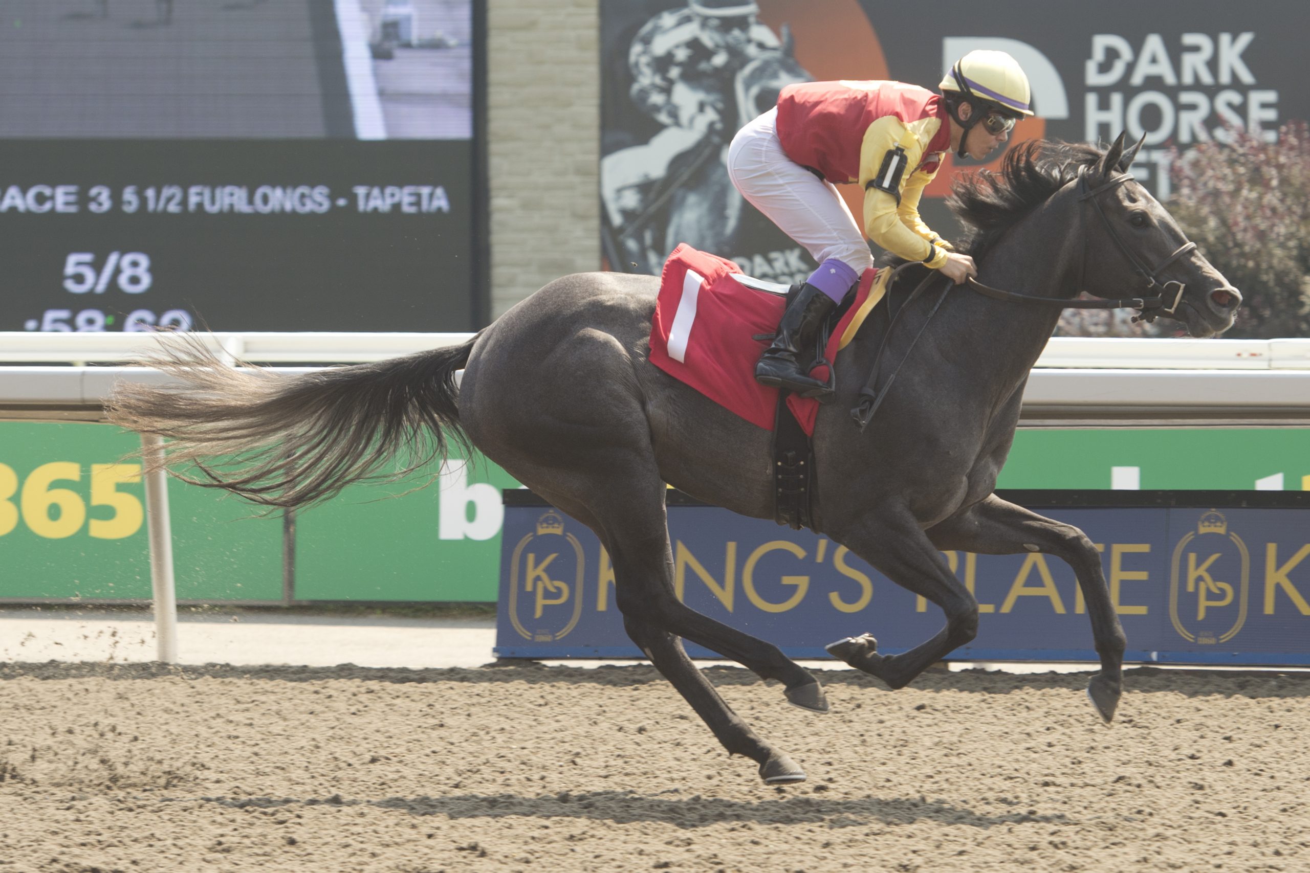 Grey Dragon made a great first impression when the 2-year-old daughter of Frac Daddy won Sunday’s third race, a 5 ½-furlong event on the Tapeta. The grey is bred Goldmart Farms, who co-owns with Royal Laser Inc. Canadian Horse Racing Hall of Fame inductee Robert Tiller is the trainer.