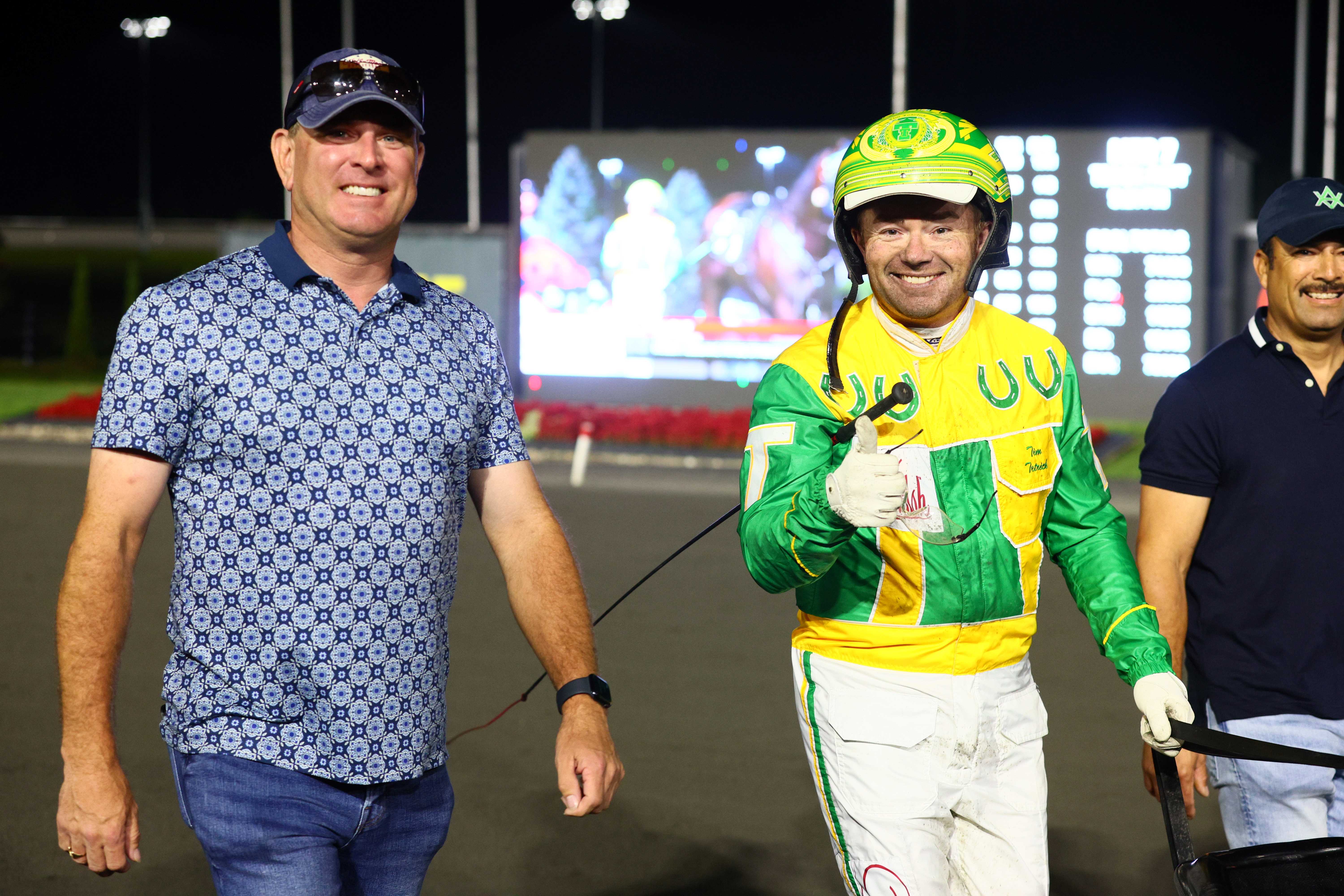 MILTON, September 21, 2024— Elimination winner Fallout forged first-over glory in the $1,000,000 Metro Pace final, delivering as the 8-5 second choice to equal the stakes and track record on Saturday night at Woodbine Mohawk Park. Blue Onyx blasted out of post 9 for the front and cleared after the first eighth, though he quickly faced attacks from Prince Hal Hanover and then Captain Optimistic through a :26.2 first quarter. Prince Hal Hanover swept to the lead and Captain Optimistic, the 6-5 favourite, soon shot forward and seized the helm as the field began to stretch to a :54.4 half. Driver Tim Tetrick had Fallout off the pylons moving up the backstretch, but never flushed a helmet to follow. So Tetrick sent Fallout forward on the rim and came looming after battle-weary leaders as they scurried by three-quarters in 1:22.1. Captain Optimistic clung to a diminishing lead once Prince Hal Hanover pulled pocket to assault, all the while Fallout continued to gain to the center of the track. Fallout reached the wheels of Prince Hal Hanover nearing the final eighth and sprung into another gear to slide by Prince Hal Hanover and win by just over a length. Captain Optimistic settled for third and Swingtown rallied from third over for fourth. Fallout and driver Tim Tetrick winning the Metro Pace final on September 21, 2024 at Woodbine Mohawk Park (New Image Media) “I was just kind of playing the race, and then I could see they were gonna’ play some chess early,” Tetrick said after the race. “Yannick still got a pretty easy first half. But you know, this colt just kept coming and digging, and we kept having a helmet to follow. When it mattered he got to the wire first.” A colt by 2012 Metro Pace winner Captaintreacherous, Fallout won his third race from eight starts and has now earned $590,783 for owners Robert LeBlanc, Pryde Stables, Inc. and Caviart Farms. Tony Alagna trains the Brittany Farms-bred colt to add a fourth Metro Pace trophy to his mantel. He won with Captaintreacherous and then in 2014 with Artspeak and in 2020 with Exploit. “This horse showed that he had the ability. It just looked like he was going to take a couple starts for him to get really fit and really into it,” Tony Alagna said after the race. “We took him to Kentucky, we raced him down there twice or three times, and it looked like he was going to be [in] tough down there so we thought, ‘You know what? We have good luck in Canada. Let’s take him to Metro and see what happens.’ And he just exploded up here. You know, he’s been lights out both weeks. “I thought the way Timmy raced him was going to get the miles in him that he needed to come up here,” Alagna also said. “I think probably one of the biggest changes coming up here, we changed his bridal from Lexington to here, and we changed him to aluminum shoes. And, you know, aluminum shoes on the Lexington surface is kind of a 50/50, thing. But we know what they can do to a horse up here in Canada, and we made a decision to come up here. I said, ‘Okay, it’s time to switch him to aluminum,’ so that really cleaned up his gate and I think that’s kind of what put him over the top.” Tony Alagna and Tim Tetrick (New Image Media) Fallout, besting his 1:49.3 lifetime-best performance in his Metro Pace elimination, equaled the 1:49.1 stakes record established by Tall Dark Stranger in 2019 as well as the track record set in 2011 by A Rocknroll Dance. The mile was one-fifth of a second off the Canadian record set in 2011 by Sweet Lou. Fallout paid $5.30 to win. By Ray Cotolo, for Woodbine Communications Share This:Share