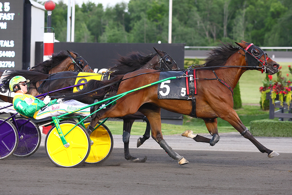 MILTON, June 15, 2024— Driver Tim Tetrick wrangled Call Me Goo to sit off the speed and caught a covered ride to vault effortlessly by 1-5 favourite M Ms Dream in the stretch and win the $233,000 Armbro Flight final at Woodbine Mohawk Park on Saturday (June 15). Leaving from post 5, Tetrick floated Call Me Goo off the wings and landed in fifth just behind M Ms Dream to a :26.4 first quarter clicked by post-10 starter Tipsy Moni. Tipsy Moni, clearing Tactical Mounds for the point, then managed to slow the tempo up the backside to a :56 half as M Ms Dream waited until the final turn to make a move. Once M Ms Dream pulled off the pegs, Call Me Goo had cover to the final turn but found herself third over when Chake swiftly angled outside to make a charge after Tipsy Moni. Chake drew alongside her tempo-setting stablemate by three-quarters in 1:23.3 and slid to the lead while M Ms Dream and Call Me Goo fanned wider for open racetrack. M Ms Dream gathered momentum and began inching forward, though Call Me Goo furiously hit the center of the track with a menacing challenge to the favorite. Tetrick simply worked to keep Call Me Goo straight as she barreled forward in the late stages and edged away to a half length win in 1:51.2. M Ms Dream settled for second, Chake took third and Tactical Mounds wove around horses for fourth. Call Me Goo and driver Tim Tetrick winning the Armbro Flight Final on June 15, 2024 at Woodbine Mohawk Park (New Image Media) “When she’s on a helmet, she’s perfect. But when you give her half a cue, she wants to take all of it,” Tetrick said after the race. “She’s really nice to drive until she gets free lane [because] she wants to go real fast. “I wanted to be able to trip her out, put her on a helmet, because I think she’s really good off a helmet,” Tetrick also said of his strategy going into the race. “Just the last couple of weeks we haven’t been able to do it because of circumstances. She still got the job done both times, [she] was first and second. Then today she just proved that she is a good horse.” Call Me Goo, a 4-year-old daughter of Googoo Gaagaa, collected her fourth win from five starts this season and her 20th win from 28 starts in her career, good for $619,959 in earnings. Jason Skinner trains the hallmark mare of his barn for owner Graham Grace Stables LLC “She’s by far the best I’ve ever trained,” Skinner said after the race. “She’s put me on the Grand Circuit. I’ve been here a couple of times, but never with a dominant horse like her. She’s definitely the best one.” Off the second choice in the betting, Call Me Goo paid $8.70 to win. By Ray Cotolo, for Woodbine Communications Share This:Share