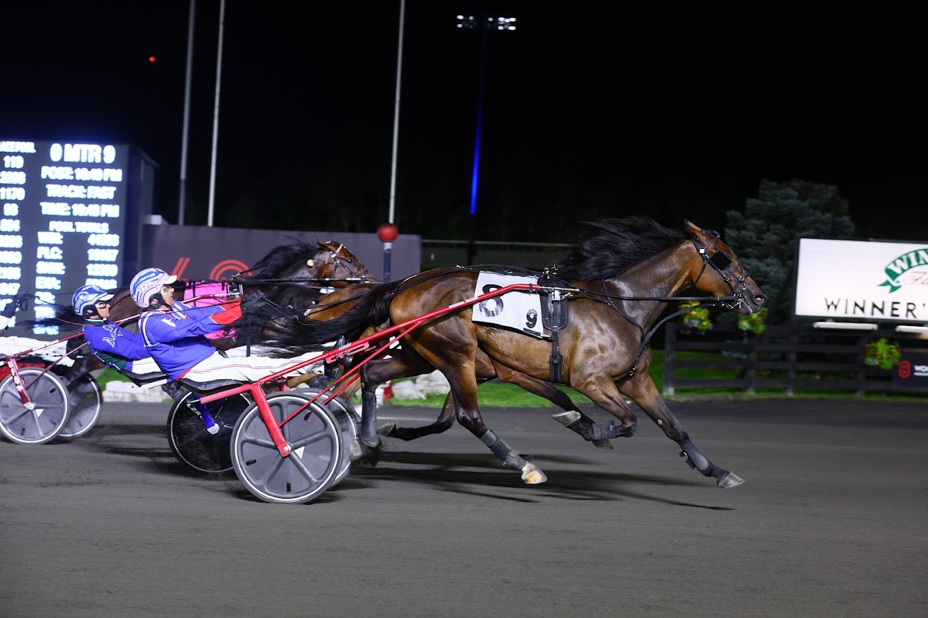 MILTON, September 2, 2023 — Sophomore trotting filly Climb The Pole and sophomore trotting gelding Gaines Hanover came with late accelerations to each capture their respective division of Simcoe Stakes at Woodbine Mohawk Park on Saturday night. Climb The Pole lunged in the closing strides to collar tempo-setter and 4-5 favourite Righteous Resolve to snag the $157,200 Simcoe for three-year-old trotting fillies in 1:52.2. Righteous Resolve revved off the wings and claimed command to a :26.3 first quarter with HP Extra Ice securing the pocket. Strolling firmly up the backside to a :55.3 half, Righteous Resolve stayed on the muscle through the final turn as HP Extra Ice readied a charge from the pocket. But after three-quarters in 1:24, Righteous Resolve kicked for home on an extended lead. Driver Jody Jamieson perched Climb The Pole on cover spinning into the stretch and launched her past HP Extra Ice with Baroness Hill rallying wider. Righteous Resolve stayed resolute on the point until the final eighth, where driver James MacDonald called upon her to engage with her late-rallying challengers. Climb The Pole hit another gear in the closing strides to down Righteous Resolve by a half length with Baroness Hill settling for third and Smashin Racquets another six lengths behind in fourth. Climb The Pole and driver Jody Jamieson winning the Simcoe Stakes for 3-year-old fillies on September 2, 2023 at Woodbine Mohawk Park (New Image Media) “She just tries; she never gives up,” said Jody Jamieson, who co-owns Climb The Pole with trainer Carl Jamieson, Steve Heimbecker and Aaron Byron. “She’s just a sweetheart, really. She’s an ornery mare sometimes, but when you get a racehorse like her and she tries every week… you can’t beat that.” A daughter of Kadabra, Climb The Pole continues to add to a productive campaign off a two-year-old season where she only started twice. She’s now won seven races from 12 starts in her career and banked $295,468. Off the second choice in the betting, she paid $5.30 to win. Gaines Hanover gobbled rivals down the center of the track while avoiding late-stretch trouble to take the $177,300 Simcoe for trotting sophomores in 1:53.1. Hasty Bid hustled to the lead to a :28 first quarter and soon yielded control to Osceola into the backstretch. Ghostly Casper, parked through the first turn, advanced towards the leader to a :56 half. Osceola kept him wide to the final turn as Ghostly Casper continued pestering the pacesetter to three-quarters in 1:24.1 all while Southwind Coors readied a three-wide charge and Gaines Hanover a four-wide charge. Osceola swung for home clinging to the lead as Hasty Bid looked for clearance to pull from the pocket. Southwind Coors and Gaines Hanover gathered their momentum on the straightaway and marched furiously after the leader while Hasty Bid got hooked by the wheels of a tiring Ghostly Casper in the last eighth. Gaines Hanover outmuscled Southwind Coors to the beam to take a neck victory with Osceola third and 130-1 shot New Rules grabbing fourth. Gaines Hanover and driver Sylvain Filion winning the Simcoe Stakes on September 2, 2023 at Woodbine Mohawk Park (New Image Media) “I’ve raced against him so many times and I was real happy to get the drive on this guy for this race here,” said driver Sylvain Filion on acquiring the drive behind the Richard Moreau trainee since regular pilot Louis-Philippe Roy opted to drive Tuscan Prince, who broke behind the gate. “I thought it was the only way to go – I floated out of there and got cover. Even though I never saw pylons, he swelled up around the last turn and he just wanted to go so much. He tries so hard.” Gaines Hanover, a gelding by Cantab Hall and a winner at Woodbine Mohawk Park last year in the $810,000 Breeders Crown Two-Year-Old Colt and Gelding Trot, has now collected six victories from 16 starts and earned $666,236 for owner Gestion J. Y. Blais Inc. He paid $13.50 to win. By Ray Cotolo, for Woodbine Communications Watch the race replays here: Share This:Share