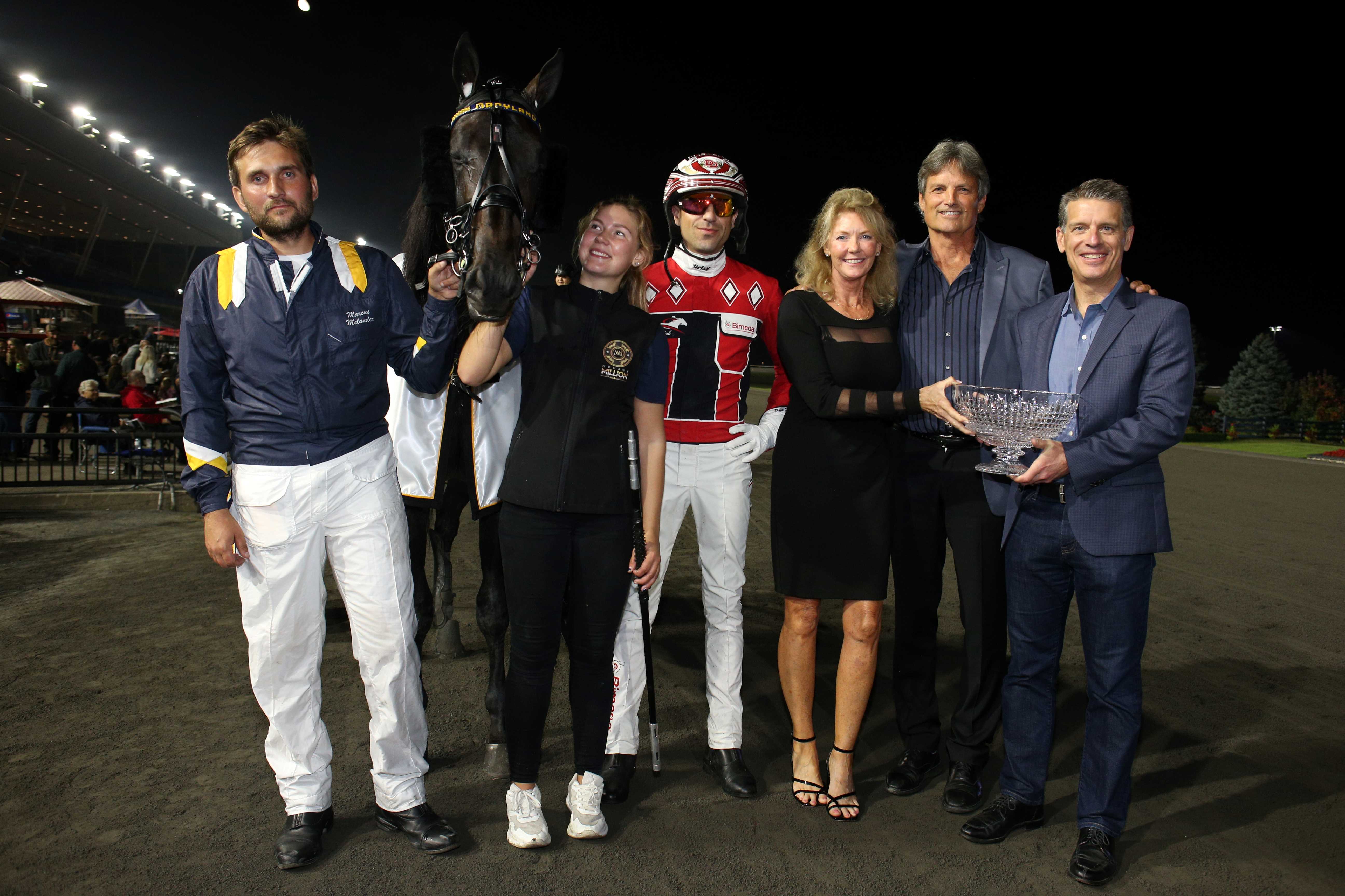 MILTON, September 21, 2024 – Maryland powered home to take all the spoils in the Mohawk Million, putting an exclamation point on a picture-perfect Saturday night for driver Dexter Dunn. After taking the inside track, literally, to impressive victories in the $347,000 Elegantimage (with French Champagne) and $713,000 Canadian Trotting Classic (with Amazing Catch), Dunn engineered a different trip, but produced the same result, in the Mohawk Million. Meshuggah, in rein to Scott Zeron, blasted off the wings and took the lead heading into the first turn, followed by Lookatmegoamigo, Go Ahead Makemyday, and Lasting Dream, while Maryland sat an unfettered sixth through an opening panel in :27.1. It was status quo on the front end through a half in a tepid :56.2, as Dunn continued to hold a patient hand, now positioned seventh, on the 4-5 choice. Meshuggah was still on top through three-quarters in 1:24.3, as Lasting Dream looked to ratchet up the pressure. Monalishi arrived on the scene in third, while Maryland, now fourth, was five lengths off the leader, but full of trot and rolling to the outside. Maryland, whose slot owner for the Million was Hunterton Farm, began to methodically pick off his rivals down the lane, blasting to the front with ease en route to a sharp 3 ½-length score after a :27.1 final quarter. Lasting Dream was second, Meshuggah third, and Onajetplane finished fourth. The final time was a stakes, track, and Canadian record 1:52.3. Maryland and driver Dexter Dunn winning the 2024 Mohawk Million (New Image Media) “He was pretty aggressive tonight,” said Dunn. “He hasn’t really been like that before, and now the horse outside was pretty fired up on the gate too. And there was a bit going on, but we had a little bubble there before the gate left, but he luckily kept his gate. We still got away in a pretty decent position, and just around the last turn, I nearly lost him there for a bit, but he got himself up. “I was still confident, especially coming off the last turn, and he was close enough that he’s fast enough.” For the son of Chapter Seven-Crucial, who won the $575,000 William Wellwood Stakes on August 24 and the $527,027 Peter Haughton Memorial on September 13, it was the third straight command performance and biggest payday of his career. “He’s probably the smartest colt I’ve been around,” said trainer Marcus Melander, who won the 2022 Million with Oh Well. “He wants to do his work. Then, you never know how much the other horses have left, but if he has the position to win when they’re turning from home, he’ll win.” With Saturday’s win, Maryland is now 4-1-1 from 7 starts, to go along with nearly $1.1 million in lifetime earnings. “I think pretty much when he was racing at the Meadowlands early, he just showed so much talent,” said Steve Stewart of Hunterton Farm. “And that last 16th, he always just seems to accelerate. There was one race early that I think a horse came up on him and it looked like he was going to go right by him, and he just wouldn’t let him go, and it seems like he’s very versatile. “Marcus has been saying that the one thing that separates him from a lot of horses is he’s so intelligent.” Michael Copeland, CEO Woodbine Entertainment, presenting the Mohawk Million trophy to the connections of Maryland (New Image Media) Maryland, owned by Courant Inc., PCW Racing, Holly Lane Stud East and SStewart R Thorn Stable, will head home to the Garden State the newly minted Million champion. “We will ship him back home to New Jersey and prepare him for the Breeders Crown, since he won last week and he’s already eligible for the finals,” noted Melander. “So, that will be his next race, probably. Maybe, we’ll do a qualifier in between, but that’s what we’re waiting for right now.” Bred by Hanover Shoe Farms, the bay colt, who won his debut at The Meadowlands on June 28, was a $475,000 purchase at the 2023 Lexington Select Yearling Sale. Maryland paid $3.90 for the win. Chris Lomon, Woodbine Mohawk Park Share This:Share
