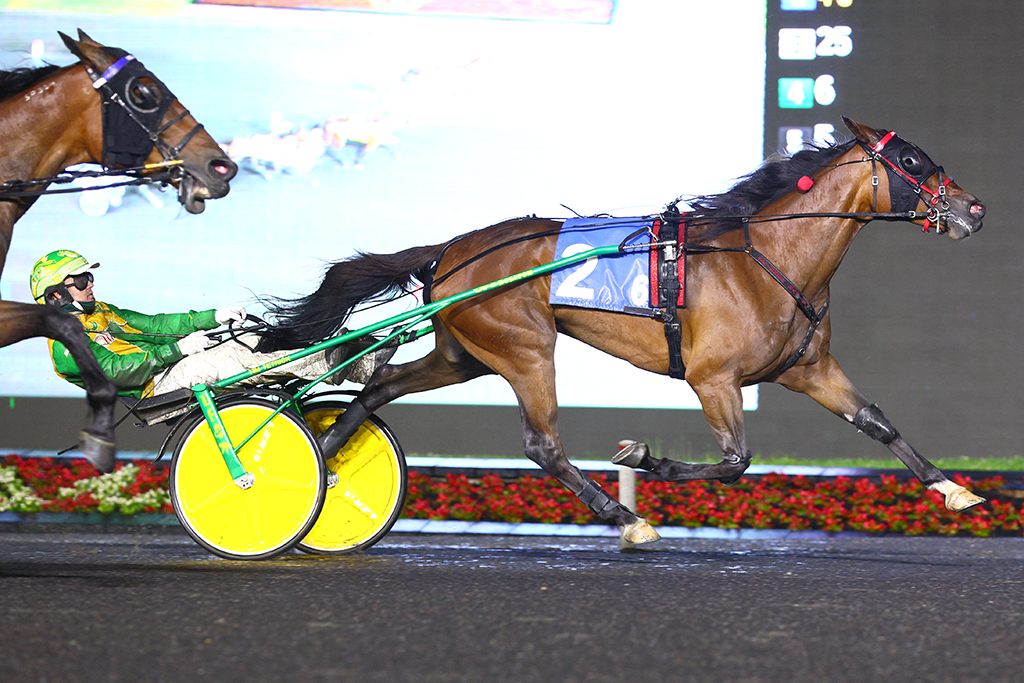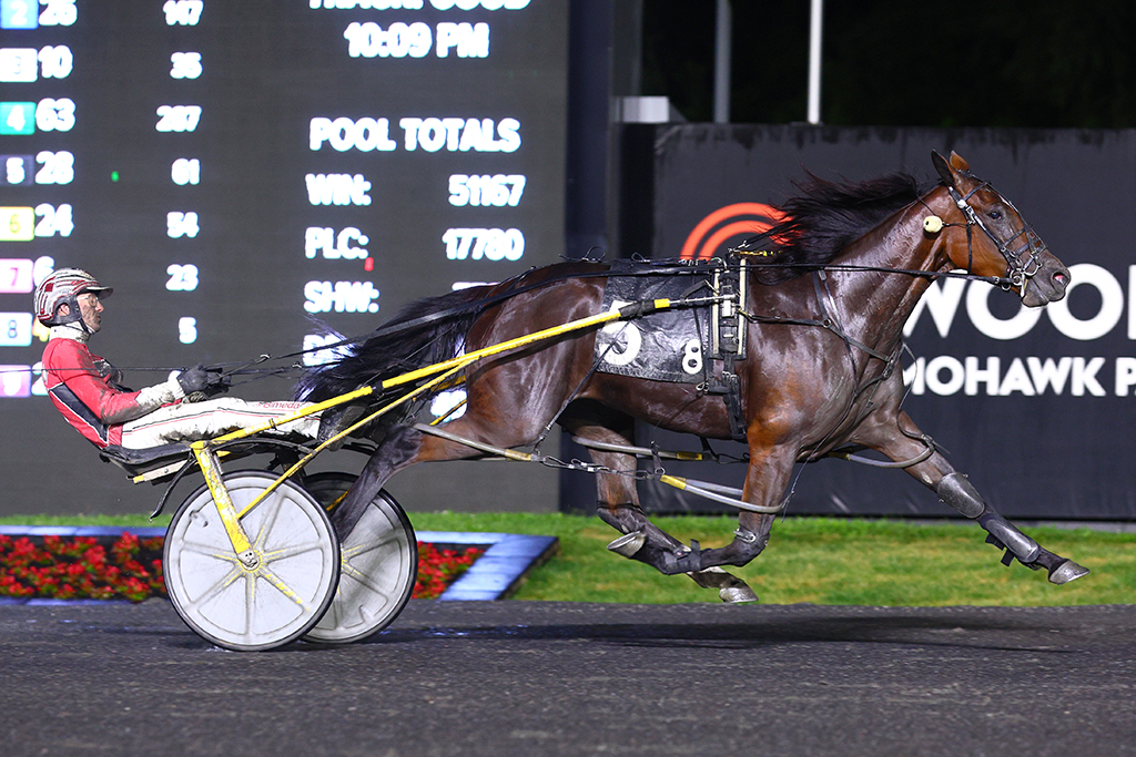 MILTON, June 8, 2024 – The finals for next Saturday’s Fan Hanover Stakes and Armbro Flight were determined Saturday night at Woodbine Mohawk Park. A pair of eliminations were required for both events, with three-year-old pacing fillies clashing in the Fan Hanover and older trotting mares meeting in the Armbro Flight. My Girl Ej handed Geocentric just her second loss in the first $35,000 Fan Hanover split. Driven by Dexter Dunn, My Girl Ej got the lead exiting the first turn before being covered up heading to the half. The Ron Burke trainee angled out going to three-quarters, grabbed the lead and would go the rest of the way. Geocentric sat fourth throughout and was put down to the drive in the lane, working up at the leader, but ultimately coming up a head short in 1:50.1. Pass Line, Flawless and Reigning Jade rounded out the top-five. A daughter of Sweet Lou, My Girl Ej picked up her first win of the season in her second outing. She posted five wins in 13 starts last year, including a victory in the Breeders Crown. My Girl EJ and driver Dexter Dunn winning the first Fan Hanover Elimination on June 8, 2024 at Woodbine Mohawk Park (New Image Media) “She was wandering a little when she got by herself,” said Dunn of My Girl Ej entering the stretch. “But then when she heard (Geocentric) coming she took off again. She’s a game little filly.” My Girl Ej is owned by Burke Racing Stable, Weaver Bruscemi, Elizabeth Novak and Mitchell Friesen. She paid $11.20 to win. The second Fan Hanover elimination saw Canigetalouploup ride the rail from last to a 1:51.1 upset victory for Dunn and Burke. Its A Love Thing rallied from overland at the head of the lane and looked to have a victory in sights. However, the rail opened up for Canigetalouploup to fire through and pull off a 28-1 upset win by a length and three-quarters. Canigetalouploup and driver Dexter Dunn winning the second Fan Hanover Elimination on June 8, 2024 at Woodbine Mohawk Park (New Image Media) “I mean, there was a lot of speed early…we got away last, and there was lots of action,” said Dunn. “We were just sort of sitting back there, and we did a bit of ducking and diving and weaving, and she sprinted up the lane pretty good.” Odds On Platinum, Pass And Stow and Caviart Belle completed the top-five to advance. Canigetalouploup is now two for three this season and five for 18 overall. She’s earned over $170,000 for owners Burke Racing Stable, Lawrence Karr, Phillip Collura and Weaver Bruscemi. A $2 win ticket on Canigetalouploup paid $59.90. The draw for the $425,000 Fan Hanover final took place following the eliminations. Elimination winners secured a post from two to six. 1 – Its A Love Thing 2 – Pass And Stow 3 – Canigetalouploup 4 – Reigning Jade 5 – Geocentric 6 – My Girl Ej 7 – Pass Line 8 – Odds On Platinum 9 – Caviart Belle 10 – Flawless The Armbro Flight for older trotting mares saw a pair of small field eliminations held. M Ms Dream took care of business in the first $35,000 elimination for driver David Miller and trainer Ron Burke. The five-year-old took the top spot in the second-quarter and trotted home to a 1:52.4 score, improving to a perfect four for four this season. Miller continued his praise for the mare post-race. “She’s pretty steady, pretty consistent. I mean, she does some pretty amazing things.” M Ms Dream is now a 29-time winner for her career with over $1.5 million in earnings for Eleven Star Stables, Frank Baldachino and Hillside Stables. Tipsy Moni, Hp Mama B, Rose Run Yolanda and Adare Castle completed the top-five. M Ms Dream paid $2.90 to win. M Ms Dream and driver Dave Miller winning the first Armbro Flight Elimination on June 8, 2024 at Woodbine Mohawk Park (New Image Media) Call Me Goo moved to the lead in the second-quarter and went on to a 1:53.3 win in the second elimination. Tim Tetrick guided the Jason Skinner trainee to her third win in four starts this year. A four-year-old daughter of Googoo Gaagaa, Call Me Goo is a 19-time carrer winner with over $500,000 earned for owners Graham Grace Stables. Call Me Goo paid $3.60 to win. Call me Goo and driver Tim Tetrick winning the second Armbro Flight Elimination on June 8, 2024 at Woodbine Mohawk Park (New Image Media) The draw for the $233,000 Armbro Flight final took place following the eliminations. 1 – Rose Run Yolanda 2 – Tactical Mounds 3 – Chake 4 – Refined 5 – Call Me Goo 6 – M Ms Dream 7 – Adare Castle 8 – Warrawee Xenia 9 – Hp Mama B 10 – Tipsy Moni Mark McKelvie, Woodbine Communications Share This:Share