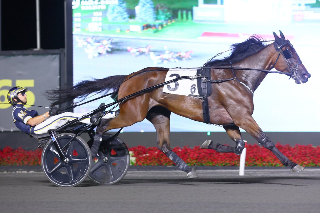 MILTON, August 31, 2024— Hambletonian runner-up Highland Kismet glided over the Woodbine Mohawk Park oval as the prohibitive 1-9 choice on Saturday night to lower the stakes record in the $164,000 Simcoe Stakes under wraps. Again, driver Bob McClure gapped the gate a tad with Highland Kismet, but as positions started to settle through the first eighth he hit the motor on the Mark Etsell trainee. Highland Kismet swiftly grabbed the lead from his stablemate Willowtime after a :27.3 first quarter and strode without a sweat to the backside. “I don’t worry about him. He’s push button now leaving out of there,” McClure said after the race. “You just want to keep them out of trouble. And that’s all I did. I just let the leaver settle and I left mine outside. Coasted to the front, and he took care of the rest.” Highland Kismet saw nary a rival once on the lead. He clicked past the half in :55.4 and 1:24.2 before spurting away on his own volition to a 3-3/4-length win over 98-1 shot Masstercraft. Paquet, the 7-1 second choice, closed for third and Bryant Bros S, who pulled first over midway around the final turn, settled for fourth. Highland Kismet and driver Bob McClure winning the Simcoe Stakes for 3-year-olds on August 31, 2024 (New Image Media) The 1:51.3 mile by Highland Kismet bests the previous stakes mark of 1:51.4 set back in 2010 by Jimmy Takter pupil Little Brown Fox. Saturday’s win for Highland Kismet also marked the first start that the Father Patrick gelding raced without trotting hopples. “We’ve trained him quite fast without them, and we felt that maybe we could develop more speed without them, but I was a little nervous,” trainer Mark Etsell said. “We thought about it, but we thought we we’d wait till after the Hambo for sure, and then make that decision and go from there. That’s why we qualified him, and Bob was very confident with him, so we said we’ll go with it tonight and see what happens.” “I think me and Mark both agreed that the race that he struggled in the Meadowlands [the Stanley Dancer Memorial] was, you know… Mark had trained him a fast mile without them. I think he kind of learned to reach more. And I think that night, the hopples were kind of jamming him up. I think that was most of the problem that night. And then with how loose Mark had them, he let them all the way out there. He was practically tripping on them. I didn’t think they’re really doing much. I think they did a lot more for Mark than they did for [Kismet]; it made him feel better. But I don’t blame him. All the way training down, this horse never wanted to stay flat. So, I see a different horse. I’ve seen one that hasn’t done anything wrong.” Making just the 10th start of his career, Highland Kismet collected his sixth win and added to a bankroll now worth $583,085 for owner-breeder Highland Thoroughbred Farm. “It’s a lot of fun,” McClure also said. “And I think, like Mark said, it’s only his tenth lifetime start, he’s still improving quite a bit. It’s exciting to see what he’s going to do, come October in Lexington and those places. I wouldn’t trade him for anybody. Not just because it’s with Mark and Mary, but he’s an extremely special horse, and he’s a lot of fun to drive, and I’m lucky to be sitting behind him.” Highland Kismet, who Etsell indicated is bound for the Canadian Trotting Classic and then the Bluegrass Stakes at The Red Mile, paid $2.20 to win. Drawn Impression imposed further supremacy over her peers with another decisive victory in the $156,000 Simcoe Stakes for 3-year-old trotting fillies. Outfooted early by R Liza out of post 10, driver Louis-Philippe Roy floated Drawn Impression forward from post 9 and sat an unhurried fifth while parked on the rim through a :26.4 first quarter. R Liza cleared the lead to the backstretch and promptly reeled in her speed for a breather, leaving Roy in the perfect spot to push and take over command just past a :56.1 half. “I wasn’t too worried, because I was kind of letting her trot,” said Roy after the race. “I’ve just been easy on her. Like you go a quarter in :28 with her, it’s like if you’re going :30 with another random horse. I mean, she just has a long stride. So the first half, even if it looks a little bit like she had much work to do, she didn’t really work herself.” Roy sat chilly as Drawn Impression cruised on the point around the final turn. She clicked past three-quarters in 1:25 and sprinted for the finish under a hand drive, registering a 3-1/2-length win as the 1-5 favourite over a fast-closing Willys Home Run, who rallied from third over to take second. Second-over Cold Snaps tipped off cover to finish third and Tactical Strike sat a ground-saving trip for fourth. Drawn Impression and driver Louis-Philippe Roy winning the Simcoe for 3-year-old fillies on August 31, 2024 (New Image Media) “The first few times I raced her on the front, like I remember qualifying her – and even the one time in Vernon – I feel like maybe she wasn’t used to it,” Roy also said. “When you got those horses who race on the front for the first time, they’re on and off, and they spend a lot of energy. But even last start and tonight, she’s just like a perfect individual to drive, like an old horse. So the way she is right now, against the competition, I feel like I can let her do what she wants. I wouldn’t want to say that she’s 100 percent safe tonight, and then see her make a break in the next few starts. I don’t want to jinx myself.” A daughter of Muscle Hill out of champion mare Emoticon Hanover, Drawn Impression has now won twice from six starts this season and six times from 12 starts in her career, good for $507,844. The homebred for Serge Godin’s Determination returned $2.50 to win. By Ray Cotolo, for Woodbine Communications Share This:Share