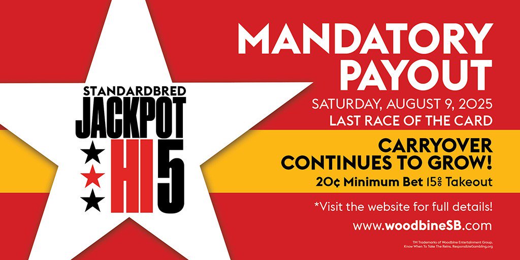 MILTON, August 6, 2025 – Woodbine Entertainment has announced a mandatory payout for the Standardbred Jackpot Hi-5 will take place this Saturday (August 9) at Woodbine Mohawk Park. The Jackpot Hi-5 carryover currently sits at $225,430.32. Jackpot Hi-5 wagering will continue to be offered on each card leading up to Saturday’s mandatory payout. The mandatory payout is scheduled for Race 11 on Saturday and will feature a field of 12. The Jackpot Hi-5 requires horseplayers to select the top-five finishers in order. A horseplayer can only win the entire jackpot if they hold the only winning ticket for that evening’s wager. If there are multiple winning tickets, half the pool is paid out, while the other half is added to the carryover. The entire carryover will be paid out, plus new money wagered, during the mandatory payout. The Jackpot Hi-5 has a $0.20 minimum and a 15 per cent takeout. For free programs and full details on live racing at Woodbine Mohawk Park, click here. Post time Saturday is 6:35 p.m. Share This:Share