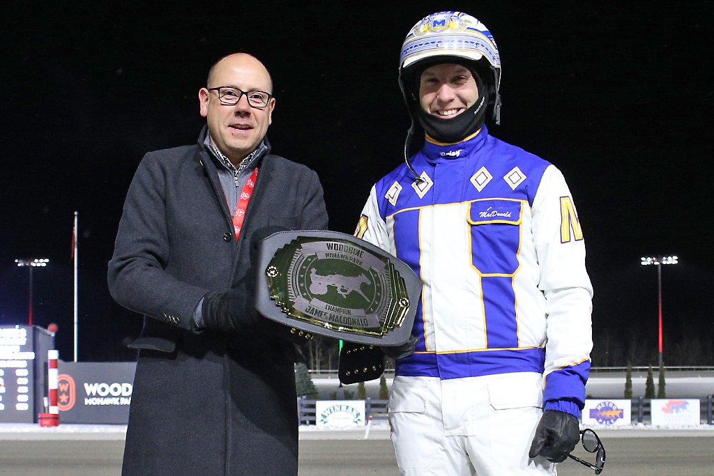 MILTON, December 23, 2024 – James MacDonald made Woodbine history on Monday evening by becoming the first driver to record three 400-win seasons. Entering Monday’s card just two shy of 400 wins for 2024 at Woodbine Mohawk Park, MacDonald both started and ended the night in style to reach the significant mark. Four-year-old pacer Nightime Dancer ($5.50) was a blowout winner in the evening’s first-race for MacDonald before nine-year-old pacer Mach Impact ($8.50) also left little doubt in the finale to give Canada’s leading reinsman his 400th Woodbine win of the year. MacDonald, who has wrapped up his fourth straight Woodbine driving title, reached 400 wins in each of the last two years, finishing both seasons right on 400. The Guelph, Ontario resident still has four cards left in 2024 to add to his season totals. Prior to MacDonald, only Doug Brown had recorded multiple 400-win seasons at Woodbine Entertainment/Ontario Jockey Club. MacDonald’s third 400-win season is the eighth 400-win season in Woodbine history. All eight 400-win seasons are listed below: 2024 – James MacDonald (400 wins as of December 23) 2023 – James MacDonald (400 wins) 2022 – James MacDonald (400 wins) 2006 – Mark MacDonald (404 wins) 2001 – Randy Waples (430 wins) 2000 – Chris Christoforou (407 wins) 1995 – Doug Brown (416 wins) 1994 – Doug Brown (412 wins) MacDonald is enjoying a record season for earnings in 2024, sitting at $12.2 million entering the final week of the year. His $12 million-plus in earnings is the best season ever by a Canadian-based driver, eclipsing Chris Christoforou’s record of $11.9 million in 2003. Adding to his accomplishments, MacDonald was recently named a finalist for both the Driver of the Year Awards in Canada (O’Brien Awards) and the U.S. (Dan Patch Awards). MacDonald will look to add to his 400-win total at Woodbine Mohawk Park on Thursday’s Boxing Day card. Post time is 1 p.m. James MacDonald was awarded a special championship belt on Saturday, December 21, 2024 to recognize his fourth straight Woodbine driving title. Bill McLinchey, Vice-President of Standardbred Racing, made the presentation. (New Image Media) Share This:Share