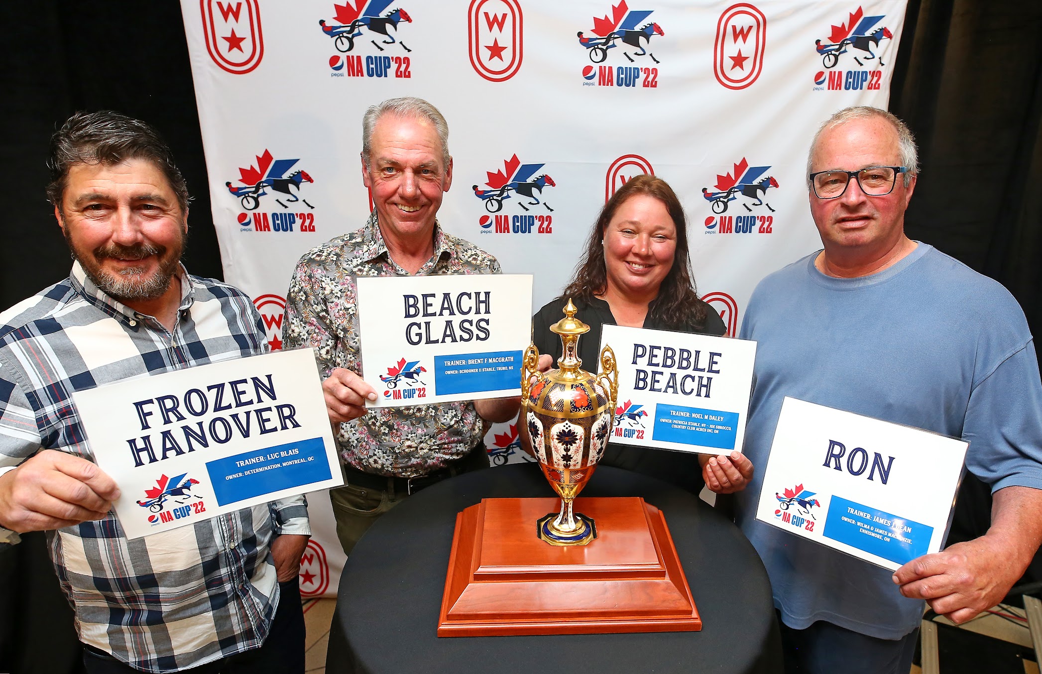 MILTON, June 14, 2022 – The field and post positions are set for this Saturday’s (June 18) 39th Pepsi North America Cup at Woodbine Mohawk Park. The post position draw for the $1 million race , featuring the finest three-year-old Standardbred pacers, took place on Tuesday afternoon at the Campbellville oval. Elimination winners Pebble Beach and Beach Glass earned their respective connections the right to select their post by winning an elimination. Trainer Brent MacGrath won the draw to have first pick and selected post-four for Beach Glass, while Sonja Booth, representing trainer Noel Daley, selected post-five for Pebble Beach. Following the draw, Pebble Beach was installed as the 8-5 morning-line favourite. The Daley trainee has won two of three starts this season and has never finished outside the top-three in 14 career starts. “That was my first option, post-four, but I couldn’t get that,” said Booth when asked about selecting post-five. “He’s settled well in Canada and we are staying at Luc Blais’ farm at Determination, so he’s loving life there. He’s very easy going at the moment.” Driver Todd McCarthy will be making his Cup debut on Saturday behind Pebble Beach. The young reinsman has taken the North American scene by storm since arriving two years ago from Australia. “I think he’s an excellent driver,” said Booth. “He gets to drive a lot of good horses, so I think he’s very comfortable coming up here.” Tuesday’s draw fell on the 14-year anniversary of Somebeachsomewhere’s Cup victory. MacGrath, who conditioned the legendary horse, is now looking to win with one of his sons, but did opt not to pick the same post (post-two) that “The Beach” started from when winning the Cup. “Middle of the gate, you can see what the outside horses are doing and that’s the position (driver) Yannick (Gingras) wanted,” said McGrath of selecting post-four. “We never expected this, I liked (Beach Glass) all along going, but to get here is nice to talk about, but at the end of the day I think there was a little more pressure back then because I probably needed the money a little more.” Beach Glass has one win in two starts this season and four for seven overall. He is a homebred for Schooner II Stable, the same connections as his sire. Trainers Luc Blais, Brent MacGrath, Sonja Booth and James Dean. (New Image Media) The other eight finalists in this year’s race went into an open draw for the remaining posts. The field, post positions and morning line odds for this year’s $1 million Pepsi North America Cup are listed below. 1 – Fourever Boy (Mike Wilder/Tim Twaddle) 20-1 2 – I Did It Myway (Tim Tetrick/Tony Alagna) 8-1 3 – Ron (Jody Jamieson/James Dean) 20-1 4 – Beach Glass (Yannick Gingras/Brent MacGrath) 3-1 5 – Pebble Beach (Todd McCarthy/Noel Daley) 8-5 6 – Ario Hanover (Dexter Dunn/Brian Brown) 10-1 7 – Night Hawk (David Miller/Brian Brown) 7-2 8 – Kolby Two Step (James MacDonald/Tim Gillespie) 15-1 9 – Frozen Hanover (Louis-Philippe Roy/Luc Blais) 20-1 10 – Mad Max Hanover (Tim Tetrick/Jake Leamon) 15-1 AE – Market Based (Dexter Dunn/Nancy Takter) The Pepsi North America Cup is carded as Race 11 on Saturday’s 13-race program. Post time for the $1 million race is approximately 10:41 p.m. A special one-hour broadcast of the Pepsi North America Cup will air on TSN5 from 10-11 p.m. Saturday’s card also features the Fan Hanover, Roses Are Red, Goodtimes, Armbro Flight and Mohawk Gold Cup Invitational. Over $2.4 million in purses will be up for grabs. A special first race post-time of 6:30 p.m. is in place for Saturday. For full event information, visit www.WoodbineMohawkPark.com. Share This:Share