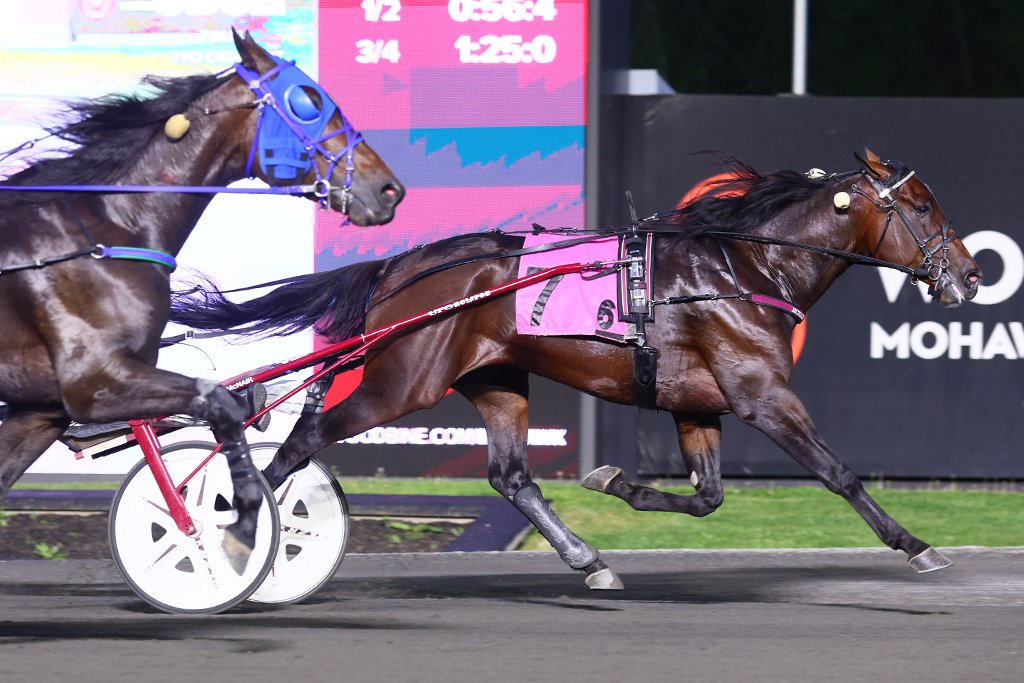 MILTON, May 17, 2025 – Ontario sired three-year-olds took centre stage on Saturday at Woodbine Mohawk Park for the SBOA Stakes Finals. All four divisions for sophomores saw finals contested on Saturday, on a windy evening at the Campbellville oval. Chantilly, the 2024 Canadian Horse of the Year, improved her undefeated record to 10 for 10 with a victory in the SBOA Filly Pace. To read about Chantilly’s season debut victory, click here. Ontario Super Stakes champion Crack Shot overpowered his rivals to win the $126,912 SBOA Final for three-year-old pacing colts and geldings. Driven by Doug McNair, Crack Shot was one of several to show early speed and would eventually drop in third coming out of the first turn. The Gregg McNair trainee didn’t sit long and would rush towards the lead, clearing just after a :54.3 first-half. Crack Shot would open up on nearest rival Fifth And Five at three-quarters and never looked back for a 3 ¾ length victory in 1:51. Sterling Choice finished second, while Boxer Seelster and Time Passer completed the Superfecta. A son of Bettors Delight, Crack Shot improved to two for two on the season and is now a seven-time winner from 10 starts for owners Gregg McNair, Dale Hunter, Frank Brundle and George Keer. Crack Shot’s victory was the latest victory for co-owner Hunter, the head coach of the Ontario Hockey League champion London Knights. The Knights captured their second consecutive OHL title on Thursday. “It’s been a busy week, but an enjoyable week when you win,” said Hunter. “To win this race and to get to go to the Memorial Cup, I love it. It’s all about sports, that’s what is a joy about it, you don’t know what’s going to happen.” With the SBOA victory, Crack Shot remains as one of the leading contenders for this year’s Pepsi North America Cup. “It’s hard to win,” said Hunter. “There’s a lot of good horses and for me it’s teams, there’s a lot of good teams in the hockey world. When you win, you’ve got to appreciate every moment.” Crack Shot’s latest win puts him over $300,000 in career earnings. He paid $2.40 to win. Crack Shot and Doug McNair. (New Image Media) Team McNair had a big night at the office on Saturday, as Doug guided the Gregg-trained Galen Erso to victory in the $130,913 SBOA Trot for three-year-old colts and geldings. A son of Green Manalishi S, Galen Erso had to grind first-up around the far turn and held off a late push from longshot Fast Snap to win in 1:55.0. Chicago Hall was third, while Cousin Halifax was fourth. Galen Erso was making his first for new owner Brad Grant, after being sold by Marcus Melander. The son of Green Manalishi S is now one for two this season and four for nine overall, with over $270,000 earned. Galen Erso paid $3.10 to win. Galen Erso. (New Image Media) The $136,513 SBOA Filly Trot went to 8-5 second-choice Green Glider for driver Bob McClure and trainer Scott McEneny. A daughter of Green Manalishi S, Green Glider showed plenty of determination by marching first-up from fifth around the far turn and powering down the lane to win by three-quarters of a length in 1:54. McClure was driving Green Glider for the first time Saturday, as regular driver Trevor Henry was out of town. “I talked to Trevor before he left and he told me just how much he liked her and how nice she was and her lines just speak for themselves,” said McClure. “I wasn’t too worried about first up, I figured it was between me and Monalishi and the way mine’s been finishing I didn’t think she could get by me.” Sprite Seelster moved to the lead in the second-split and took the field by fractions of :56.3 and 1:25.3. Green Glider would wear down Sprite Seelster throughout the stretch drive for the score. Race-favourite Monalishi, who sat second-over behind the eventual winner, just edged Sprite Seelster for second. Green Glider is now two for three to start her three-year-old season after winning twice in eight starts at age two. Her SBOA Final win takes her to $122,764 earned for owners Andrea Lea Racingstables Inc. A $2 win ticket on Green Glider returned $5.30. Green Glider. (New Image Media) Live racing resumes Monday evening at Woodbine Mohawk Park. Post time is 6:35 p.m. Share This:Share