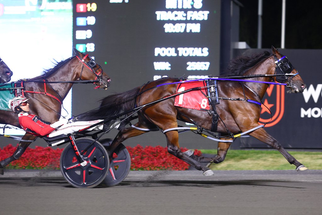 MILTON, September 14, 2024 – Twin B Joe Fresh completed the sweep of Woodbine’s marquee pacing mare events for 2024 with a victory in Saturday’s $205,000 Milton Stakes. A winner of June’s Roses Are Red, Twin B Joe Fresh had all eyes on her as the 1/9 favourite against five of the sport’s finest mares. Leaving from the rail, Twin B Joe Fresh scooted out to get away second behind rival Sylvia Hanover, who posted a :27.1 opening panel. Driver and co-owner Dexter Dunn moved ‘Joe Fresh’ around to the lead in the second-quarter to post a reasonable half of :56. With the ball in her court, Twin B Joe Fresh kicked things up on the far turn with a :27.2 third-quarter before unleashing as easy of a :25.4 final-quarter as possible to win in 1:49.1. Twin B Joe Fresh and driver Dexter Dunn winning the Milton Stakes on September 14, 2024 at Woodbine Mohawk Park (New Image Media) Not to be forgotten, Sylvia Hanover finished very strong right behind the winner to edge Silver Label for the place position. Prohibition Legal finished fourth. “She felt great, post parade tonight was probably the best she felt all year,” said Dunn of Twin B Joe Fresh. “She’s extremely bright at the moment, she’s feeling good and I was really happy with her going to the gate.” A four-year-old daughter of Roll With Joe, Twin B Joe Fresh is trained by Chris Ryder, who shares ownership with Dunn, Peter Trebotica and Barry Spak. She’s now won eight of nine starts this season to earn nearly $700,000. Saturday’s win was the 27th career score for ‘Joe Fresh’ to take her over $2.1 million in career earnings. A $2 win ticket on Twin B Joe Fresh paid $2.20. Mark McKelvie, Woodbine Communications Share This:Share
