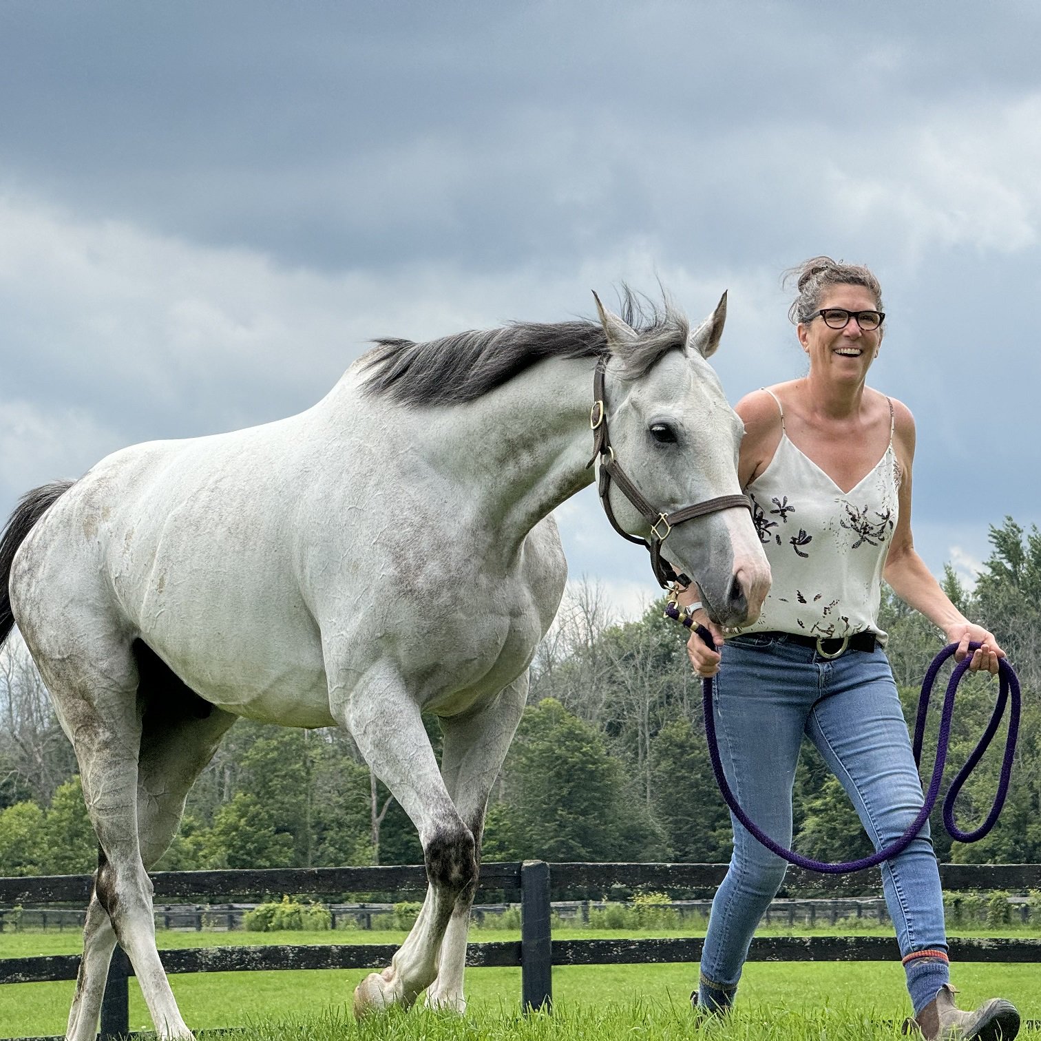 TORONTO, April 25, 2025— One look was all it took for Julie Belanger to know the grey gelding would one day be hers. Driving onto the sprawling 100-acre property in Hillsburgh, Ontario – home to more than 50 retired racehorses – Belanger smiled as she watched dozens of familiar Thoroughbreds grazing in the fields. Then she spotted an unfamiliar, yet unmistakable face peeking out from a stall at one of LongRun’s barns. “I was driving up to the farm to get some content and I saw this face poking out of the stall and a little pink nose,” recalled Belanger, who handles the reins of social media duties for LongRun, the first industry-funded Thoroughbred adoption program in Canada founded in 1999. “I thought, ‘Wow… a new horse.’” But not just any horse. The handsome grey son of Ami’s Holiday, owned by Geaux Racing, had a brief racing career: 14 starts, no wins, three seconds, and three thirds, with purse earnings just under $50,000. Winless after his first year of racing in 2022, his connections, including trainer Darwin Banach, were looking forward to Pink Gelato’s 2023 campaign, convinced he would break his maiden early on. That milestone would never come – the horse, who was bred by Ron Clarkson, had torn his tendon. The group unanimously made the decision to donate Pink Gelato to Long Run. Belanger is grateful they did. “I had no intention of adopting him because I was free leasing another horse, a warmblood. A year of us getting to know each other – it was a very reciprocal connection – Lauren [LongRun farm manager, Millet] said, ‘You should really adopt this horse.’ “I started thinking about him going away to someone else and I just couldn’t do that.” Last July, they made the adoption official. Later that year, in a LongRun Facebook post, Banach wrote, “Brings our entire barn to happy tears seeing him have such an incredible second career and having someone love him to pieces. Thank you, Julie, for letting this guy capture your heart!” Though his Hollywood leading man looks were undeniable, it was personality, not physical attributes, that won Belanger’s heart. “That [personality] is what really sold me on him. Although, I hate using that term because I was already smitten. He’s a real cuddler and very curious. He wants to interact. I would spend time with him in his stall and he was always so accommodating, letting me do whatever I needed to do.” Eventually, she would be the first to get a leg up on “Gelly.” “It came to a point where we could start riding him – people thought I was crazy to be the first one – and Lauren was very open to me being the first one. It was unreal – he was incredible. “I think he is one of those horses who went through the whole process of racing and still kept his curiosity after his final race. It’s a bit of naivete, but I think that comes from his natural curiosity. He has a bit of what might be perceived as laziness, but I think it is his way of expressing his opinion on something. There is no meanness to him at all. I feel so lucky.” Which is how Belanger describes her connection to LongRun and its beloved equine residents. “I feel blessed. I had my own company, and I was debating as to whether we should stay open or close it down. We had a commercial photography and motion company. Things were changing in that industry, and I was looking for a way to volunteer. I opted for horses because I love them, and I started volunteering with LongRun in 2019. Just over four years later, she met Pink Gelato. “I just fell in love with him.” The gelding lives at Robin Williamson’s farm in Acton, not far from where Belanger calls home. Time is always well spent whenever Belanger and Pink Gelato are together. “I do work with a coach, Samantha Fawcett, of Meraki Equestrian, who has been coaching us since November. Whatever Gelly wants to do is what we will do. I am not a competitor, but I do like dressage and jumping.” There are also trails, happy ones, that lead to memorable times for both. As for who derives the most joy from those hacks, it could very well be, in racing parlance, a dead heat. “He is always thrilled to go,” said Belanger. “I can’t believe I have this horse. I always tell him that I feel so lucky. That is what goes through my mind. It might sound mushy, but there is something very spiritual being out in nature on a horse. You can tell that he loves it. “I also want to do some different things with him, including overnight camping.” Whether it is under blue skies or starlit nights, Belanger has no preference – being with her beloved grey is all that matters. She thinks often of the journey that brought her and Pink Gelato together. “He had my heart from that first day, but I wanted to make sure everything was right for him. I started thinking about him more and more, and then the timing was right. As soon as I saw that pink nose, I knew I was done.” Belanger is grateful for LongRun and its sizable contributions to horse welfare. “I just fell in love with them. How can you not love it when the value and the goal is to help these amazing horses? “As someone who adopts from them, you feel the support from everyone there. I know I am attached to the organization, but I see that with adopters as well – it is so amazing to be connected to a place where everyone is committed to doing what is best for the horse. I say it all the time, but I do feel like I have won the lottery doing what I do with LongRun.” She hit the jackpot with Pink Gelato. Belanger has seen many others walk away smiling after interacting with him. “That [joy] is what he brings out in you. He always has to reach out and give people little kisses and introduce himself.” His proud owner has embraced the responsibility that comes with adopting a horse. Her goal for Pink Gelato is simple, yet heartfelt. “In my mind, I can go way ahead and know that if anything happens to me, I alr