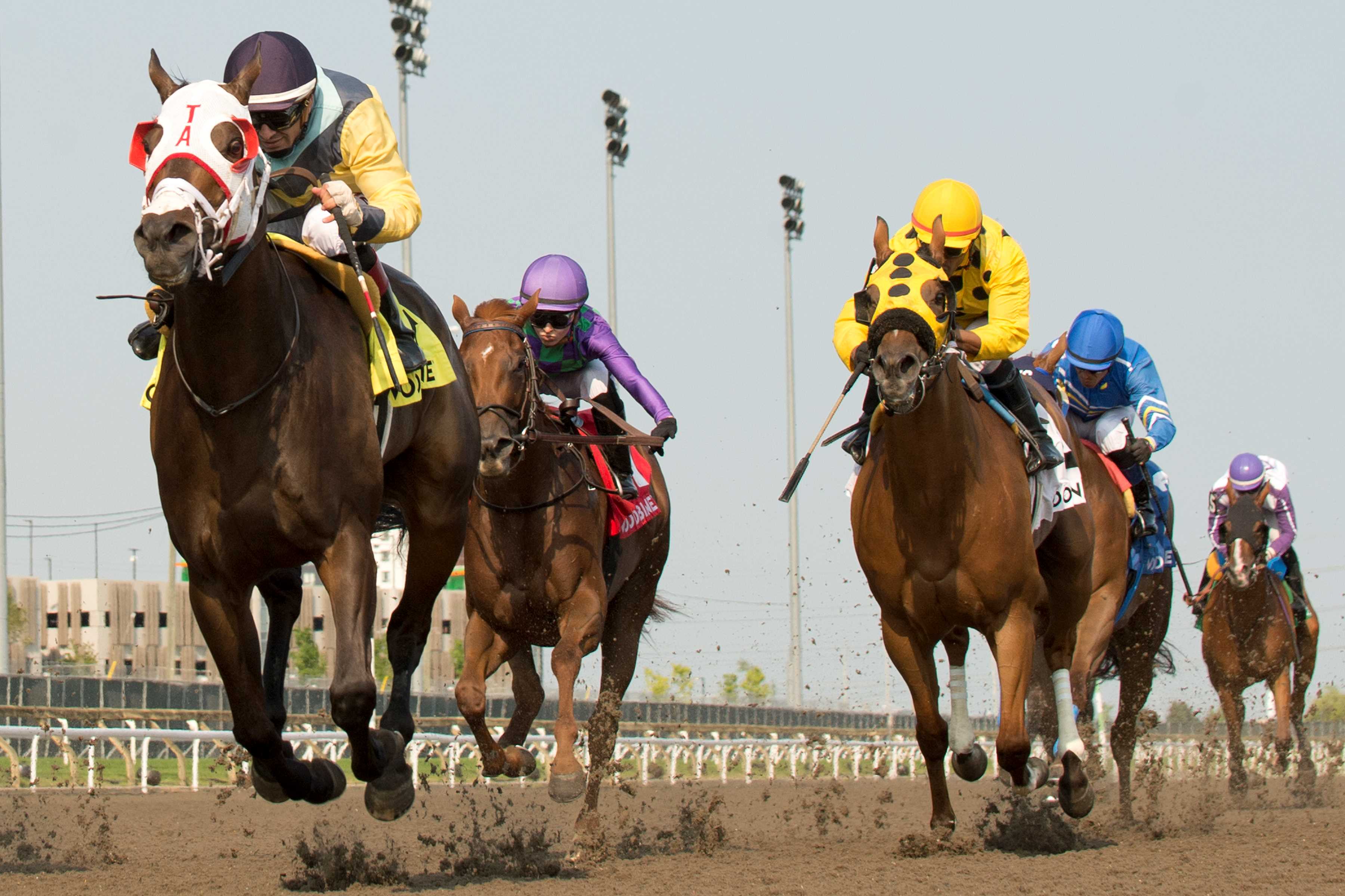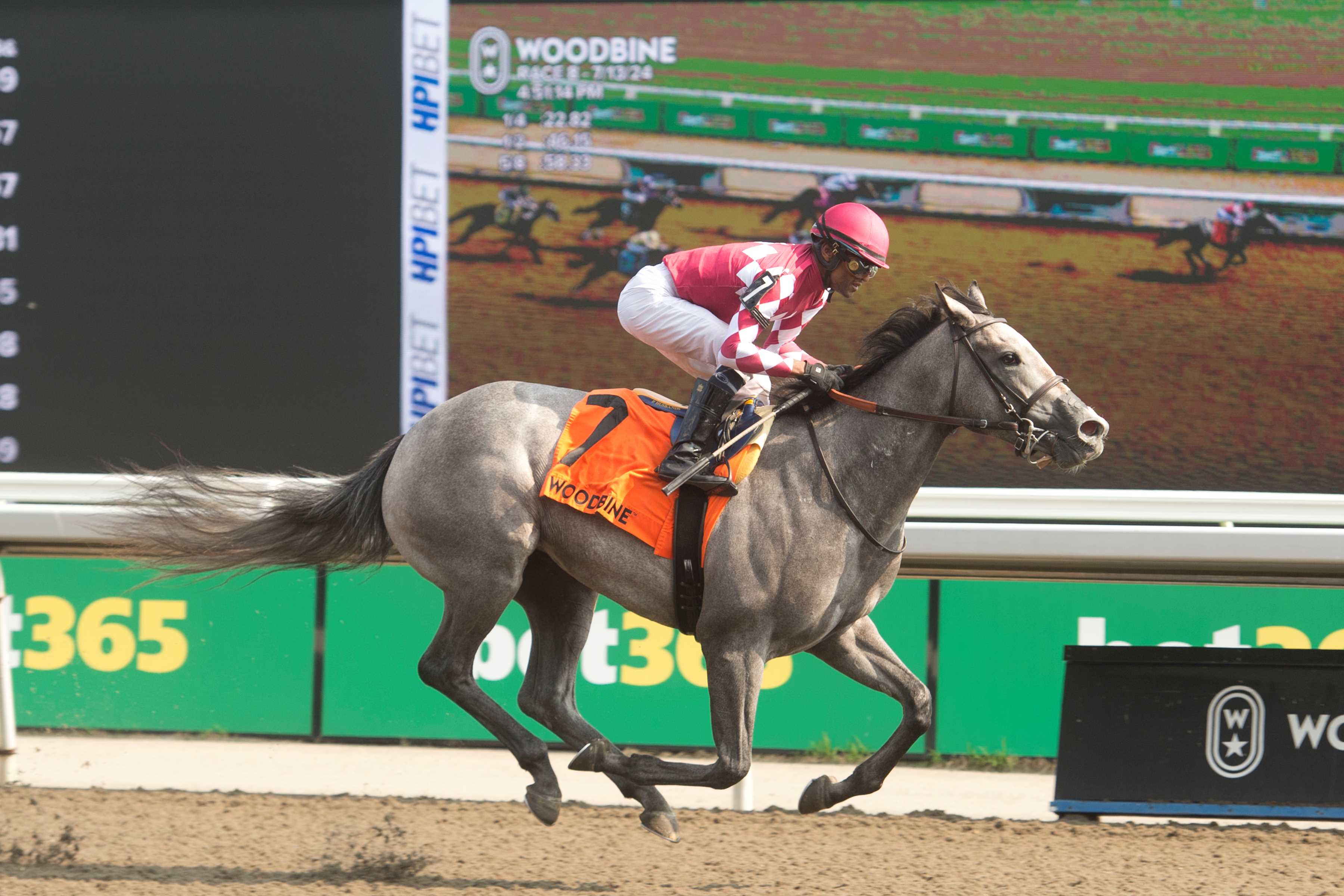 TORONTO, July 13, 2024 – Bullet, under Patrick Husbands, took the lead in early stretch and then powered away from her pursuers effortlessly to take the $125,000 My Dear Stakes, Saturday at Woodbine. The quartet of Lithica, Obliging, Bound to Be True, and Carlisle Bay scrapped over the early lead, as Bullet, sent off as the 1-2 choice, watched the foursome fracas from in fifth ahead of an opening quarter reached in :22.82. Carlisle Bay had established a two-length lead at the three-eighths mark, but Bullet fired soon after and glided up to engage her rival into the turn for home. A confident Husbands powered the daughter of War Front-Marlinspike to the front in early stretch and the pair held a head advantage at the stretch call. From there, it was simply a question of how much the winning margin would be. That answer came in the form of a 4 ¼-length score over Soupergirl. Carlisle Bay was a further length back in third and Ambitious Lass rallied to finish fourth. The final time was 1:04.85. Bullet and jockey Patrick Husbands winning the My Dear Stakes on July 13, 2024 at Woodbine (Michael Burns Photo) Husbands, who has ridden several standout rookies throughout his decorated career, had high praise for the emerging star. “She’s one of them, trust me she’s one of them,” said Husbands, when asked where Bullet ranks on the list of the best two-year-old fillies he’s ridden. “You could do anything with this filly. You can go to the lead, you can do anything. She’s all class – you can do anything with her.” Trained by dual Hall of Fame conditioner Mark Casse and owned by D.J. Stable, LLC, Bullet arrived at the My Dear off a dazzling debut in the Royal Palm Juvenile Fillies Stakes (Black Type) at Gulfstream on May 11. The grey filly was a $425,000 purchase (Hip #615) at the 2023 Keeneland Association September Yearling Sale. Bred by Gainesway Thoroughbreds LTD. in Kentucky, Bullet paid $3.10 for the win. In other Saturday stakes action, Pleasure’s Gold took the $100,000 Ballade, an Ontario-sired event for fillies and mares, 4-year-olds and up. Under Rafael Hernandez, the hard-knocking 5-year-old daughter of Souper Speedy-Good as Gold sat off the early pacesetters before hustling home to record a three-quarter length score in the six-furlong main track race. Talk to Ya Later finished second, Lantana Lady was third and Veri Gizmo was fourth. Pleasure’s Gold and jockey Rafael Hernandez winning the Bellade Stakes on July 13, 2024 at Woodbine (Michael Burns Photo) The final time was 1:10.31. Bred and owned by Elizabeth and Gordon Lickrish, the dark bay filly, trained by Tino Attard, is now 6-3-3 from 18 starts. Pleasure’s Gold, who finished ninth in last year’s Ballade, paid $10.90 for the win. Chris Lomon, Woodbine Watch the replays here: Share This:Share