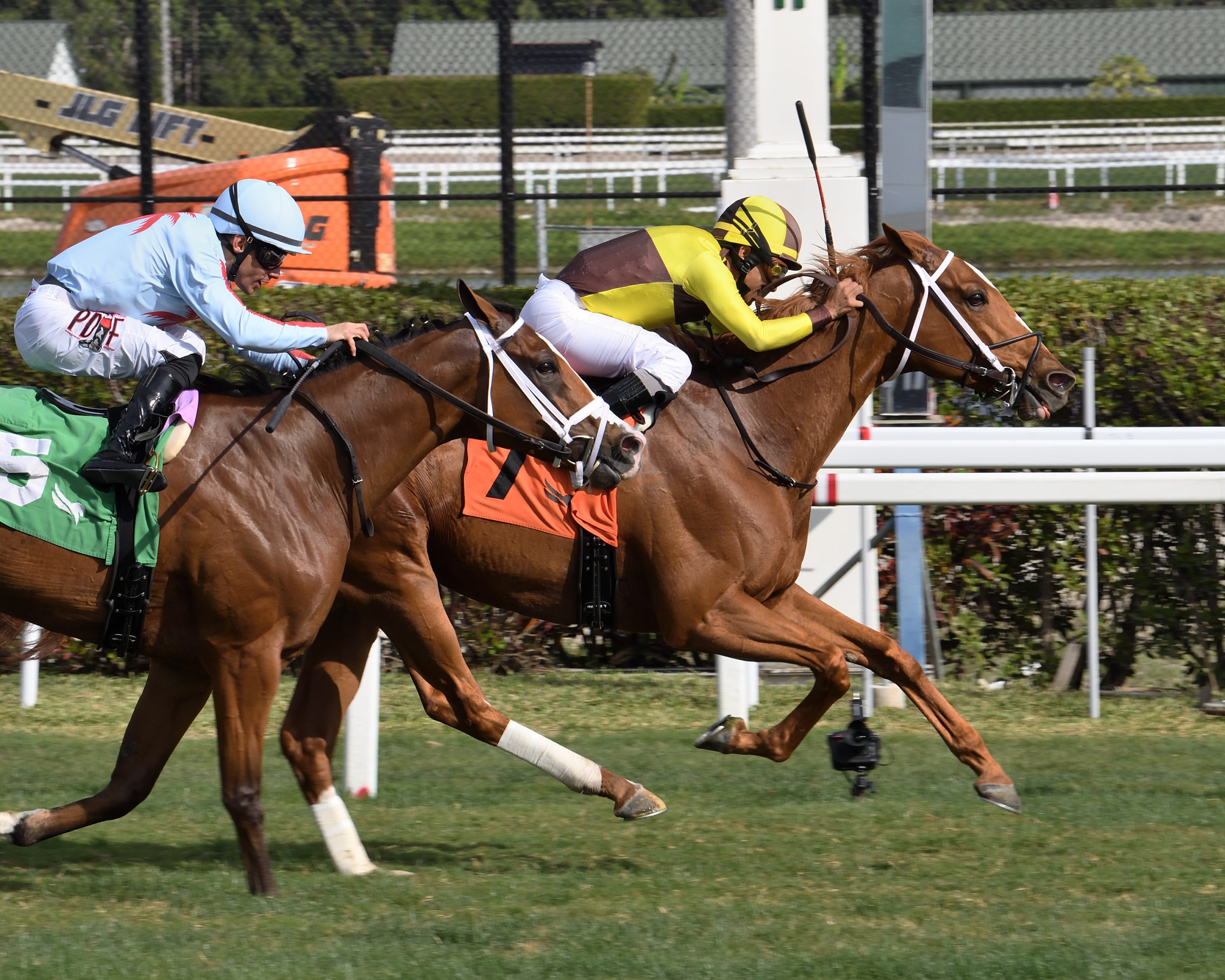TORONTO, January 16, 2024— Roaring Forties, an 8-year-old son of Stormy Atlantic, will take on six rivals as he chases his second straight score in the $75,000 Sunshine Turf Stakes, Sunday at Gulfstream. Trained by Woodbine-based Katerina Vassilieva, Roaring Forties will be making his first start of the year in the 1 1/16-mile race for Florida-breds, 4-year-olds and up. Last year in the Sunshine Turf, Roaring Forties roared to a frontrunning score in what was his first start against fellow Florida-breds. “We were able to get the lead and get comfortable fractions, where he was able to relax,” recalled Vassilieva. Shaun [jockey, Bridgmohan] did a very good job at getting him to settle and relax. He hasn’t run two turns a lot in his career – he gets a little racey sometimes – so we were hoping that if he got a clear, comfortable lead, he would be able to take it all the way. It set up perfectly for us.” Roaring Forties and jockey Shaun Bridgmohan winning the Sunshine Turf Stakes on January 21, 2023 at Gulfstream (Adam Coglianese Photo) Owned by Borders Racing Stable Ltd., Roaring Forties has had a series of four-furlong works, including a :48.95 breeze on January 5th at Palm Meadows Training Center, in preparation for his latest test. Vassilieva, who had a career-best 2023 campaign across the board, including 20 wins, has liked what she has seen from her veteran competitor ahead of the Sunshine Turf. “He’s doing great. He’s been back in Florida since the second week of December. He’s had some very good works. Shaun, who rode him in last year’s race, has been on him and is happy with him as well. We are heading into the race in good shape and are hoping to defend our title.” Bred by Stroud Lane Farm, Roaring Forties failed to meet his reserve when the hammer came down at $13,000 at the Ocala Breeders’ Sales Spring Sale of 2-Year-Olds in Training. He has gone on to make 30 starts – 28 of them at Woodbine, the other two at Gulfstream – compiling an overall mark of 7-3-2 to go along with $327,120 (U.S.) in purse earnings. Roaring Forties and jockey Rafael Hernandez winning Race 8 on September 3, 2023 at Woodbine (Michael Burns Photo) The chestnut gelding went 2-0-1 from seven starts in 2023. His most recent win came on September 3rd at Woodbine, a half-length score over 6 ½ furlongs of E.P. Taylor turf as the 9-5 choice. “He is such a cool dude,” said Vassilieva. “Everybody loves him. He’s such a laid-back, kind, sweet horse, who loves his treats. He’s 8, so he gets a lot of respect from people at the racetrack. He’s a warrior, a trier, and a horse that takes care of himself. He loves the attention, especially if you come to see him with food.” “Whenever he races, he is always there,” praised Vassilieva. “If he doesn’t win, he’s never very far out of it. You have to love his heart and his determination.” Roaring Forties (Photo by Dana Wimpheimer) Fans can watch and wager on the Sunshine Turf through HPIbet.com, bet365.com and the Dark Horse Bets app. Chris Lomon, Woodbine Communications / @WoodbineComms Share This:Share