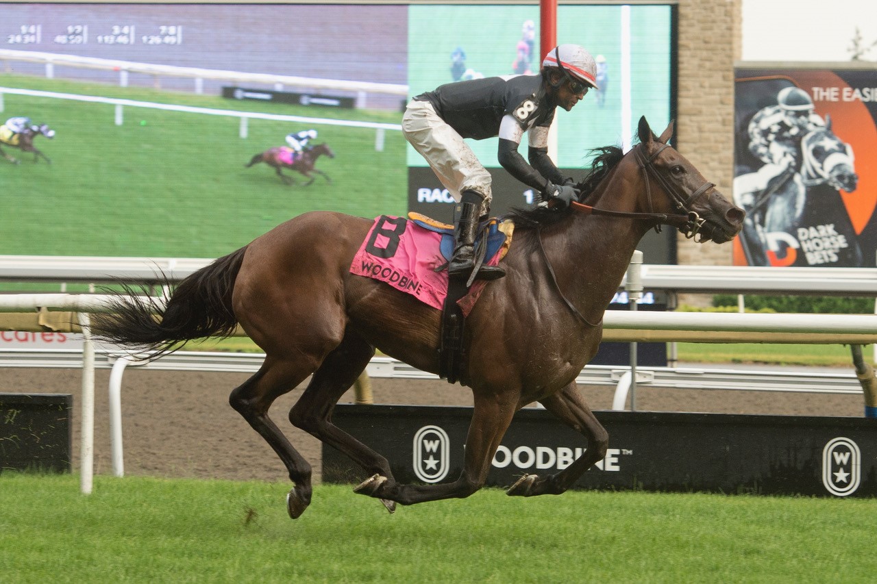 TORONTO, July 1, 2023 – Fev Rover (IRE) provided trainer Mark Casse with a Canada Day graded stakes hat trick after winning the one-mile $175,000 Nassau (G2T) Stakes for fillies and mares, 4-year-olds and up, Saturday afternoon at Woodbine. Making her fourth consecutive start on the E.P. Taylor Turf Course, Fev Rover (IRE) watched from mid-pack as longshot Sister Lou Ann grabbed the early advantage. Scotish Star (ARG) sat second with Sweet Enough (GB) positioned third and 4-5 choice Moira fourth through an opening panel over yielding turf in :24.34. It was status quo among the top four after a half in :48.50, while Patrick Husbands, aboard Fev Rover (IRE), was unhurried at the back of the pack in ninth. Poised to the outside in seventh entering the turn for home, Fev Rover (IRE) got her cue and responded with an explosive turn of foot, striking front and then holding a half-length lead at Robert Geller’s stretch call. At the wire, the 5-year-old daughter of Gutaifan (IRE)-Laurelita (IRE) was 4 ¼ lengths in front of Moira, who finished 1 ½ lengths ahead of Millie Girl. Devil’s Bit was fourth. Fev Rover and jockey Patrick Husbands winning the Nassau Stakes on July 1, 2023 at Woodbine (Michael Burns Photo) Eminent Victor, Scotish Star (ARG), Purrfect, Sweet Enough (GB) and Sister Lou Ann rounded out the field. The final time was 1:40.03, the result of a heavy downpour in the leadup to the race. “I was on the best side of the track on the wide outside and those guys keep on rolling, rolling, rolling,” said Husbands. “My horse enjoyed it on the wide outside. I’m just thinking just cut corners, cut corners, then open her up. “You get to ride good horses, they make you look good. You can do what you want to do. The race went well for me and I’m happy for Mark and the owner.” Bred by Manister House Stud, the bay mare, who endured a rough trip in her previous race, when she finished fourth but was elevated to third in the E.P. Taylor (G1T) in October, is now 4-4-2 from 15 starts. Owned by Tracy Farmer, Fev Rover (IRE) paid $9.10 for the win. Casse took three of the five Woodbine graded stakes on Saturday. Earlier in the card, Solo Album romped in the $150,000 Selene (G3) and Lucky Score won the $200,000 Highlander (G2T). He also won the fourth race with Queen Judith. Chris Lomon, Woodbine Communications / @WoodbineComms Share This:Share