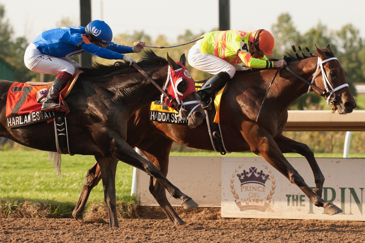 FORT ERIE, September 14, 2021 – The fan-filled crowd cheered on Haddassah in the 86th running of the Prince of Wales Stakes. The son of Air Force Blue, trained by Kevin Attard and owned by Al and Bill Ulwelling was piloted to victory by journeyman Gary Boulanger. Consulting with conditioner Attard, Boulanger was confident in his horse’s ability to capture the second jewel of the OLG Canadian Triple Crown. “Kevin said he might be the most talented three-year-old he has, but he hadn’t mentally put it together. Today, he showed he did,” said Boulanger, who captured his first Prince of Wales win. A battle down to the wire with Attard’s other trainee, Harlan Estate, Boulanger was confident his mount could get the job done in the 1 3/16-miles race over Fort Erie’s dirt course. Haddassah holds off Harlan Estate to win Tuesday’s Prince of Wales at Fort Erie. (Michael Burns photo) “He’s a horse that’s really come into himself,” said Boulanger after steering Haddassah to victory. Eighth in the Queen’s Plate, Haddassah’s conditioner Attard was extremely pleased with Haddassah heading into the Prince of Wales. “He’s trained really well since and he really matured since the Queen’s Plate – he’s more relaxed in his training in the mornings. We elected to take him off of Lasix for the Queen’s Plate and he ran without the medication today as well just because I thought it was reacting negatively to him. He put it all together today,” said Attard. Haddassah returned $15.50 to his backers. Attard’s two other contenders, Harlan Estate and H C Holiday finished second and fourth, respectively. Meanwhile, Tino Attard’s trainee, Keep Grinding finished third. Kevin Attard poses with the Prince of Wales trophy. (Michael Burns photo) An eventful day at Fort Erie, the program was filled with various stakes including the Rondeau Bay Stakes and the Lake Erie Stakes. Each race was part of the inaugural Ontario Sired Heritage Series, an exciting new eight-leg stakes series open to Ontario-sired 3-year-olds, featured both at Woodbine and Fort Erie. The Rondeau Bay Stakes went to Red Equinox with jockey Christopher Husbands. Trained by Jamie Attard for owner Norseman Racing Stable, the three-year-old filly returned $7.80 to her backers. His first stakes race win, trainer Jamie Attard, son of Hall of Fame trainer Sid Attard, said the victory was very special. “It’s something you dream about all the time when you’re growing up and thinking about getting into this business and learning from someone like my father.” The Lake Erie Stakes was captured by Red River Rebel with jockey Rafael Hernandez for trainer Kevin Attard and owners Denny Andrews and Northern Dawn Stables, Inc., returning $5.10 to win. The two cup races on the eleven-race card included the Le Cinquieme Essai Cup as well as the Molson Cup. Seau was first across the finish line in the Le Cinquieme Essai Cup. Jockey Sunny Singh picked up the mount for trainer John Simms and owner Deborah Fletcher. “He was pretty cool the first time I sat on him a few weeks ago, and he just did everything on his own and did it all right,” said Sunny Singh from the winner’s circle after the race. “He is just an awesome animal to be around, and John and his crew did a great job.” The Molson Cup was scooped up by Feature Creature and rider Kazushi Kimura, giving owner Deborah Fletcher and trainer John Simms their second cup victory on the card. It was a good day at the betting window with the handle hitting the $2 million mark. There are eleven more racing days left in the 2021 Fort Erie racing calendar. For more information, please visit forterieracing.com. (Courtesy Fort Erie Race Track) Share This:Share