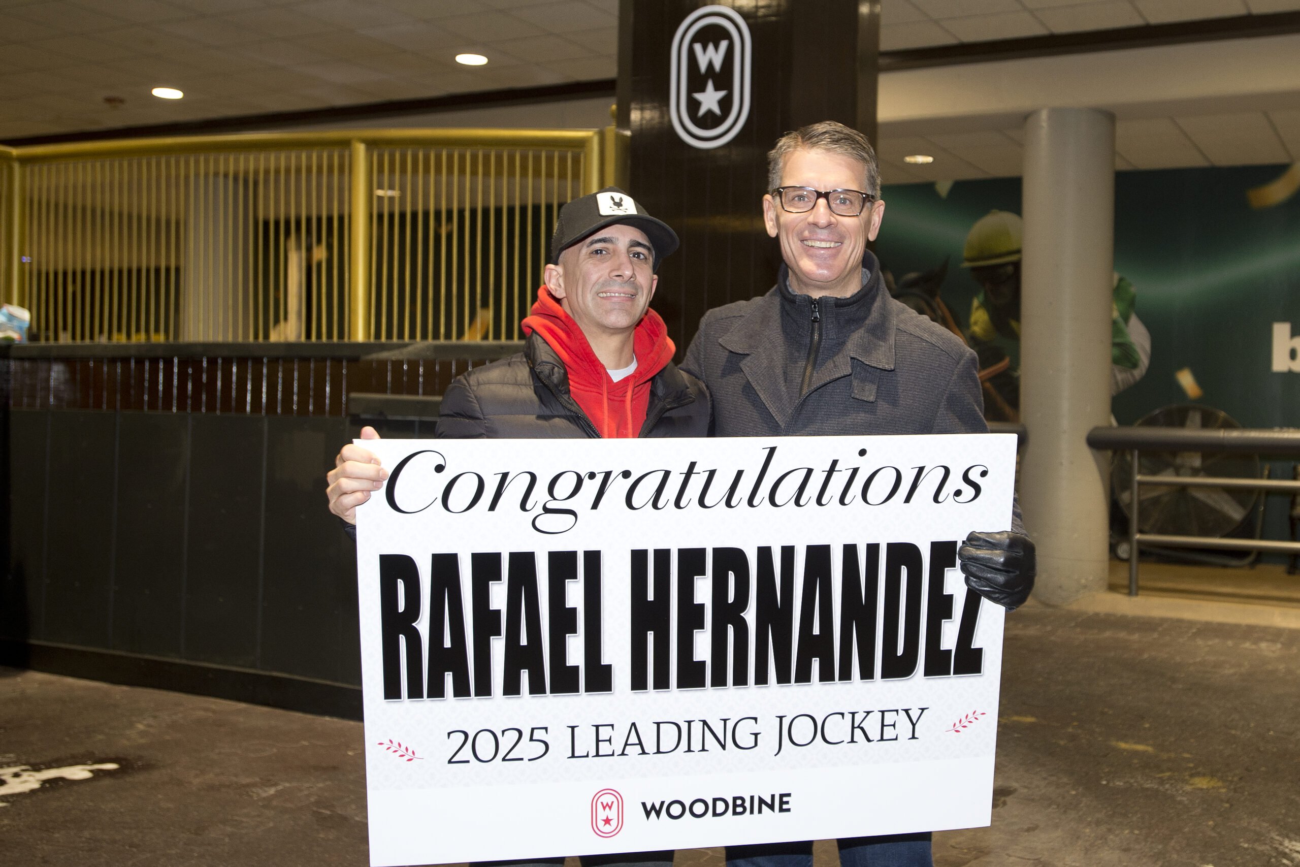 TORONTO, December 15, 2025 – The 2025 Thoroughbred racing season at Woodbine Racetrack concluded on Sunday with jockey Rafael Hernandez, trainer Mark Casse and owner Bruno Schickedanz emerging as the meet’s leading performers. Rafael Hernandez captured the Woodbine riding title with 149 victories. A native of Puerto Rico, Hernandez has been a mainstay at Woodbine since 2015 and secured his second riding championship, having previously topped the standings in 2020. Among his standout performances in 2025 were victories in the Grade 2 bet365 Kennedy Road Stakes and the Breeders’ Stakes, the final leg of the OLG Canadian Triple Crown. Hernandez also led all jockeys in purse earnings with $6.4 million (USD) and topped the stakes win category with 23 victories, including 11 graded successes. Leading jockey Rafael Hernandez and Woodbine CEO Michael Copeland (Michael Burns Photo) Pietro Moran finished second in the jockey standings with 140 wins, while Fraser Aebly ranked third with 95 victories. Hall of Fame trainer Mark Casse earned his 17th Woodbine training title. Casse trained 97 winners during the 2025 meet, including 12 stakes winners, with his runners accumulating more than $5.7 million (USD) in purse earnings at Woodbine. Martin Drexler placed second among trainers with 82 wins, while Kevin Attard finished third with 65 victories. Attard’s stable ranked second in purse earnings, compiling $4.2 million (USD). Owner Bruno Schickedanz secured his 11th consecutive Woodbine owners’ title (by wins). Schickedanz-owned Thoroughbreds accounted for 80 wins and more than $2 million (USD) in purse earnings during the season. Chiefswood Stables Limited finished second among owners with 27 wins and $1.6 million in purse earnings. Gary Barber ranked third in wins with 22 and purse earnings of $1.3 million, while Al and Bill Ulwelling were third in purse earnings with $1.4 million and 19 victories. Maximum Fifty topped the horse standings with six wins, followed by Indy One, Love You Lippy and Souper Success, who each won five races. Mansetti, under apprentice Pietro Moran, won The King’s Plate for trainer Kevin Attard and owners Al and Bill Ulwelling, while No Time, with John Velazquez in the irons for trainer Mark Casse and owner Gary Barber, took the Woodbine Oaks. Other notable victories include Silawi (IRE) in the Canadian International (G1T), Notable Speech in the Woodbine Mile (G1T), She Feels Pretty earning top prize in the E.P. Taylor Stakes (G1T), Argos winning the Summer Stakes (G1T), Corsia Veloce coming out on top in the Natalma Stakes (G1T), No Nay Hudson (IRE) netting top prize in the Nearctic Stakes (G2T), Breath Away taking the Dance Smartly Stakes (G2T), Ready for Shirl winning the Canadian Stakes (G2) and Gas Me Up (G2T) taking the King Edward Stakes. -30- Share This:Share