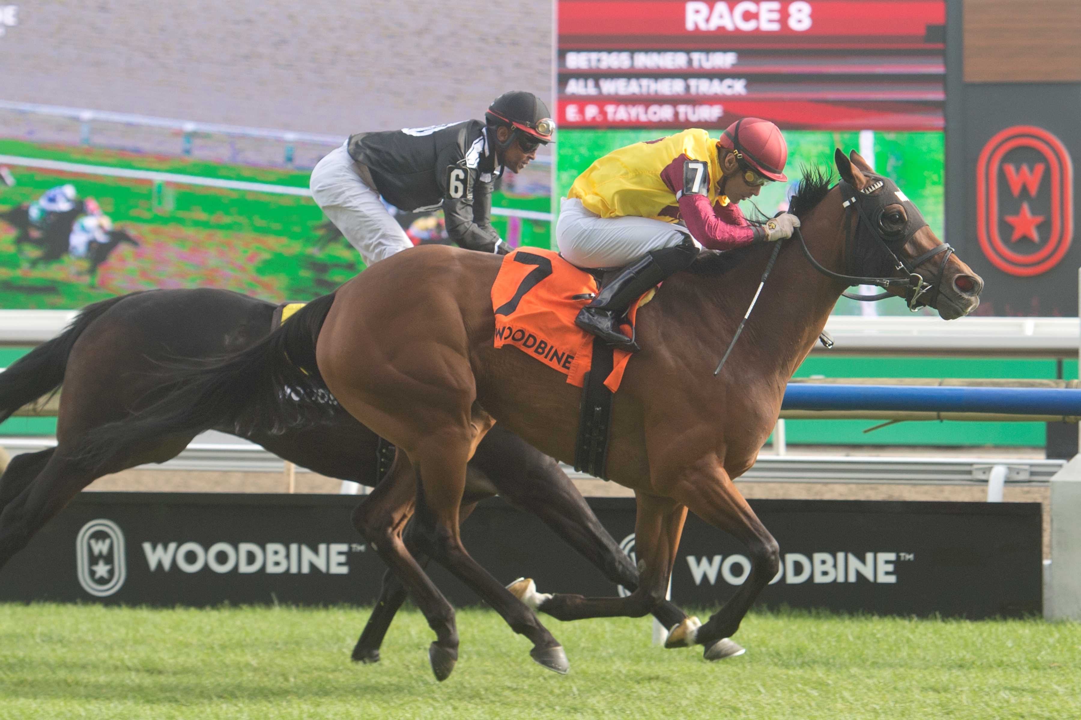 TORONTO, September 8, 2024 – Hurricane Clair was able to best a stubborn Stormcast to win the $250,000 Wonder Where Stakes, the third leg of the Canadian Triple Tiara, Sunday at Woodbine. Stormcast, a dominant winner of the Bison City, second jewel in the Triple Tiara, and Hurricane Clair, runner-up in that race, set the stage for what would be a stretch-long duel in the 1 ¼-mile turf race for Canadian-foaled 3-year-old fillies when they came out of the gate one-two entering the first turn. It was Stormcast, the 1-5 choice, who found the front and held a two-length advantage over 7-1 second choice Hurricane Clair through an opening quarter in :25.05, followed by Kevin Attard trainees Vucchella and My Girl Della. There was little change throughout the seven-horse field after a half in :48.38, as Stormcast continued to call the shots, while Hurricane Clair and jockey Sahin Civaci continued to shadow the frontrunner. As the field navigated its way into the final turn, it quickly became a two-horse race as the leaders separated themselves from the pack and commenced a stirring stretch battle down the long E.P. Taylor stretch. Neither filly gave an inch, Hurricane Clair to the outside, and Stormcast along the rail, as the former led by a head at Robert Geller’s stretch call. It was Hurricane Clair who ultimately gained the upper hand late to eke out a half-length win over a determined Stormcast. Saccharine secured third, three-quarters of a length in front of My Girl Della. The final time over good ground was 2:01.14. Hurricane Clair and jockey Sahin Civaci winning the Wonder Where Stakes on September 8, 2024 at Woodbine (Michael Burns Photo) A Little Frisky, Vucchella, and Quality Presence rounded out the order of finish. “We had a good trip,” said Civaci, who has been aboard the daughter of Silent Name (JPN)-Hurricane Lorraine for all but one of her starts. “I was trailing the favourite and I kept an eye on him. And my horse was going along pretty well too. I was comfortable with the pace, and when it was time, just nudged up to him, and it was a battle between two good horses. They both were holding onto their ground, and we just inched up before the wire.” “She’s getting her confidence and knowing what’s going on. She’s running much better now.” Hurricane Clair, who broke her maiden in last year’s Muskoka Stakes, competed in all three legs of the Canadian Triple Tiara. She was third in the Woodbine Oaks Presented by Stella Artois on July 20 and second in the Bison City Stakes on August 10. “We’ve been a little bit quiet the last couple of weeks, so it’s been a needed a confidence builder here,” said Martin Drexler, who trains for David Rowbotham, Rodney Carpenter and Tony Boogmans. “This filly has been doing everything right the whole time. “I figured the way that the track’s playing today, you had to be in the race early. I told Sahin to just, don’t let the other one get away too far, and then we’ll just see what we’ve got.” Bred by Bru-Mel Stables Co., Hurricane Clair was $35,000 purchase at the 2022 CTHS Canadian-Bred Yearling Sale. Greg Howell is the groom. Now 3-3-2 from 10 starts, Hurricane Clair paid $16.40 for the win. Chris Lomon, Woodbine Share This:Share