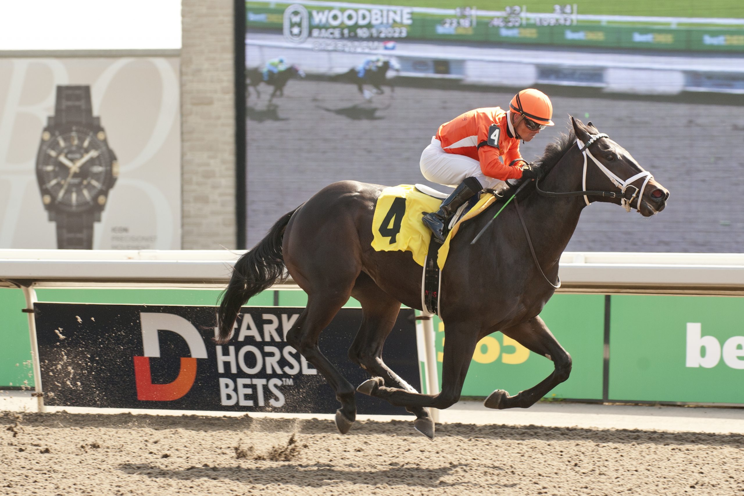 TORONTO, October 25, 2023 – Junior Hot Shot steps into the stakes spotlight for the first time in Saturday’s $100,000 Frost King at Woodbine. The son of Souper Speedy-Executive Dreamer arrives at the 6 ½-furlong Tapeta event for Ontario-sired 2-year-olds off a dazzling debut on October 1 at Woodbine. Under Justin Stein, aboard again for the Frost King, the John Ross trainee, sent on his way as the 9-5 choice in the 6 ½-furlong Tapeta maiden optional claiming race, hit the gate on the break but recovered quickly to dictate the pace. Ahead by four lengths at the stretch call, Junior Hot Shot glided to the wire under a hand ride to record a 6 ½-length victory in a time of 1:15.81. Junior Hot Shot and jockey Justin Stein winning Race 1 on October 1, 2023 at Woodbine (Michael Burns Photo) “I never get too cocky with any of my horses, but I knew for a long time that when this horse ran, he was going to be ready,” said Ross. “I put on my suit because I knew we were going to get our picture taken. I said to everyone, ‘I love this guy today.’ All the signs were there. When Justin came back to the winner’s circle, he said, ‘You’ve got yourself a racehorse on your hands.’ The way the horse opened up down the lane with that beautiful stride he has was great to watch.” The dark bay, who was RNA at the 2022 Canadian Premier Yearling Sale for owner and breeder T and T Racing, impressed Ross from the outset. “We took a lot of time with him this spring,” said Ross, who will also send out Garofoli, fresh off a maiden-breaking score on October 6. “He’s a gorgeous horse. I like the Souper Speedy ones quite a bit. To me, he is one of the finer Ontario-sired stallions around right now. So, when we got this horse, he was beautiful, but he needed time to grow into himself. When the growth plates in his knees closed, we started breezing him nice and easy. Each time we did, he impressed us and showed a lot of ability. But it was also his character that stood out. He does everything so cool. He is absolutely gorgeous, with the beautiful bone he has throughout his body, shoulder and back end.” The colt has reminded Ross, who eclipsed the 600-win mark for his career this year, of a past star in his barn. Go Greeley, a son of Horse Greeley-Orchids Halo, was a multiple stakes winner over a prosperous 29-race career. “The build of Junior Hot Shot is just like Go Greeley, with that strong, sturdy build. I’m a conformation freak and these two are quite similar in look.” Junior Hot Shot, noted Ross, has lived up to his name so far. “We feel good about him. Things have gone very well with him. I couldn’t wait to enter him in the race. He worked in a minute flat (October 20) and that was breezing in company with a nice horse that I have. I feel confident in the way he looks and acts and how he is feeling. He’s the first one crying for his feed after a workout. You have the horses might be a little tired for a day or two after they race, but this guy, he has got some toughness inside of him.” Oniel McIarty is the groom. Other starters include No More Options, who broke his maiden in his most recent start, and Siesta Beach, a Michael Doyle trainee who has posted consecutive wins. Frost King won stakes races in Ontario, Manitoba and Alberta and competed at many of the leading tracks in the U.S., winning stakes at Keeneland and Chicago’s Sportsman’s Park and placing in major events in Massachusetts, Illinois, and Michigan. In 1981, at age 3, Frost King represented Canada in the inaugural running of the Japan Cup, finishing second. He was Canada’s champion 3-year-old in 1981 and the following year was named Horse of the Year, champion grass horse and older horse. During a 55-start career, he was never worse than third on 40 occasions. Of his 27 victories, 21 came in stakes races. The South Ocean is scheduled as Race 10 on Saturday’s 11-race card. The Frost King goes as Race 8. First post time is set for 1:15 p.m. Fans can watch and wager on all the action through HPIbet.com, bet365 and the Dark Horse Bets app. $100,000 Frost King (Race 8) 1 – Garofoli – Luis Contreras – John Ross 2 – Junior Hot Shot – Justin Stein – John Ross 3 – Hatmaker Gizmo – Patrick Husbands – Josie Carroll 4 – No More Options – Kazushi Kimura – Zeljko Krcmar 5 – Yacht Boy – Rafael Hernandez – Norm McKnight 6 – Olivia Rose – Eswan Flores – Mark Casse 7 – Siesta Beach – Sahin Civaci – Michael Doyle Chris Lomon, Woodbine Communications / @WoodbineComms Share This:Share