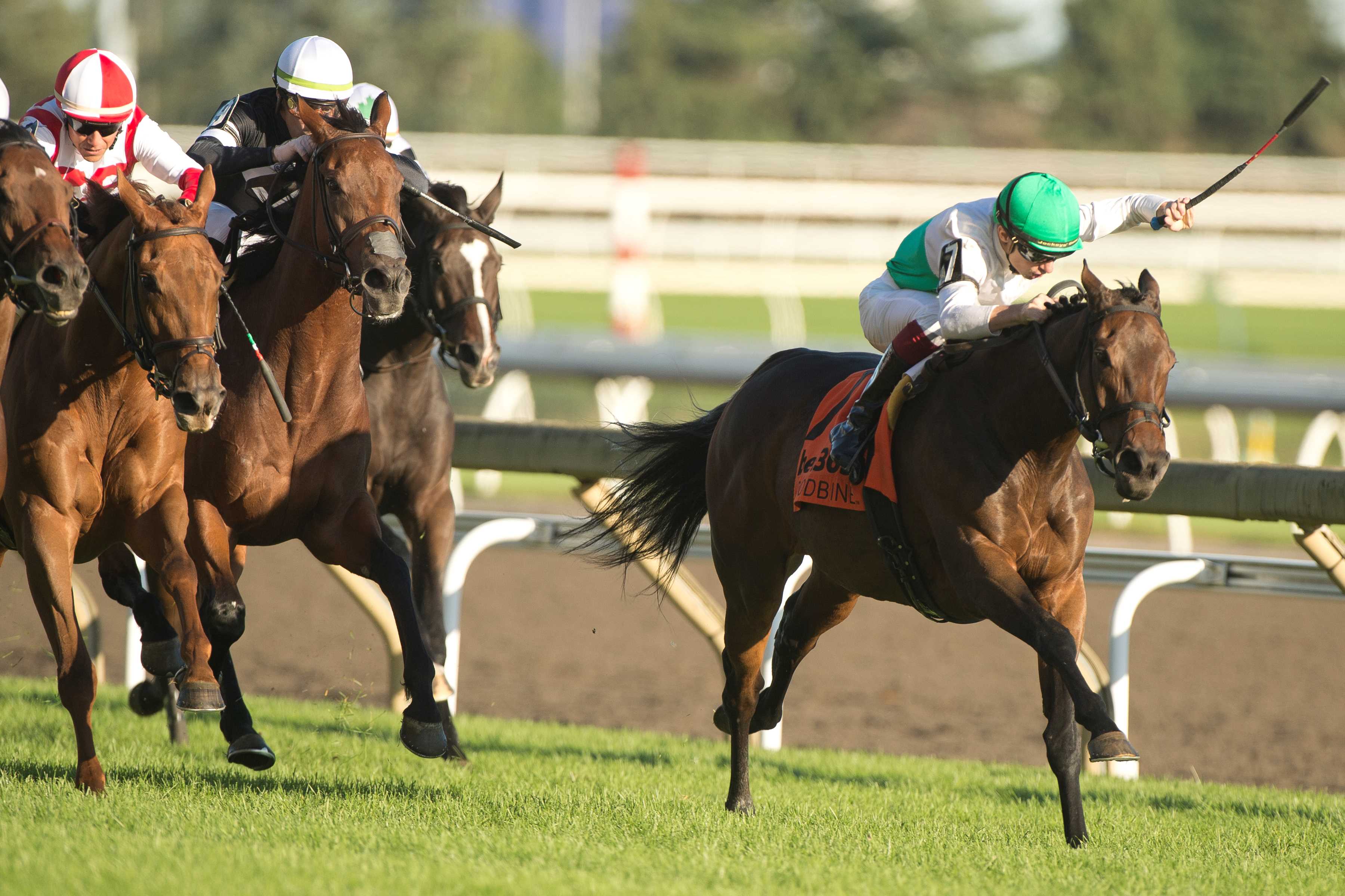 TORONTO, October 5, 2024 – Mouffy gave jockey Vincent Cheminaux, trainer Jonathan Thomas and owner and breeder George Strawbridge, Jr. a sibling turf-stakes double as she hung in gamely for a head victory in the $200,000 bet365 Dance Smartly Stakes (G2T), Saturday at Woodbine. But unlike her half-brother Truly Quality, who had kicked off the celebrations as the 9-5 choice in the Singspiel (G3T) two races earlier, Mouffy was prevailing at a price of $30.80 while racing in a solid field of 12 fillies and mares over 1 1/16 miles of good going on the E.P. Taylor turf. Both Truly Quality and Mouffy had another thing in common Saturday as they both came from well off the pace to prevail. Mouffy and jockey Vincent Cheminaud winning the bet365 Dance Smartly Stakes (G2) on October 5, 2024 at Woodbine (Michael Burns Photo) “With her, it was a little more expected,” said Thomas, who had watched Mouffy close from well back. “The other horse runs a little closer, and she was always traveling on the bridle.” Longshots had been prominent in the early stages of the Dance Smartly while Mouffy bided her time from near the back of the pack through fractions of :23.06, :47.60 and 1:11.85, but was rolling on the outside coming into the stretch. “I thought there was a good pace, which she needs to kind of relax,” said Thomas. “And I thought Vincent did a great job of saving ground and then tipping out onto the part of the track that’s probably a little firm, and it really helped accentuate her turn of foot.” Nadette (FR), who had trailed the field, also finished very strongly to just miss giving trainer Neil Drysdale a Dance Smartly double as he sent out Miss Dracarys to take last year’s renewal. Tax Implications (GB) finished third, 2 ¼ lengths back, but was demoted to fourth behind Fev Rover (IRE) following a claim of foul by jockey Sahin Civaci, which was upheld by the stewards. Fev Rover, Canada’s reigning Horse of the Year and headed for the auction ring in Kentucky this fall, finished gamely in her final race. Millie Girl, who had loomed a serious threat on the inside around the final turn, ended fifth and was followed home by Mission of Joy, Princess Calla (SAf), Canisy, Queen Macha, Spansive, Sparkle Blue and Dolce Sopresa. The final time was 1:42.07. Mouffy and jockey Vincent Cheminaud winning the bet365 Dance Smartly Stakes (G2) on October 5, 2024 at Woodbine (Michael Burns Photo) Mouffy, a Kentucky-bred 5-year-old, was recording her first graded stakes score in the Dance Smartly and bumping her record to 6-4-0 from 14 starts. The bay had finished second in Santa Anita’s Grade 2 Buena Vista over one mile of good going at Santa Anita this spring and captured Aqueduct’s listed Perfect Sting under similar conditions two starts back. In her most recent outing, Mouffy had finished a non-threatening ninth in the Ladies Turf (G3) at Kentucky Downs. “Kentucky Downs is probably the one place you can forgive a horse for really not showing up,” said Thomas. “It was a little soft that day, hot. It was uncharacteristic for her to run like that, so we’ve, just gave it a pass and wanted to make sure we got her back on a good turf course.” Thomas also pointed out the importance of Mouffy’s victory beyond the immediate moment. “They better put the mare in bubble wrap,” said Thomas. “We’ve tried to resume build with her, because she’s an Uncle Mo out of a really nice Smart Strike mare. And while we want to win races, we also want to make sure she earns her way into a brood mare band.” Bill Tallon, for Woodbine Communications Share This:Share