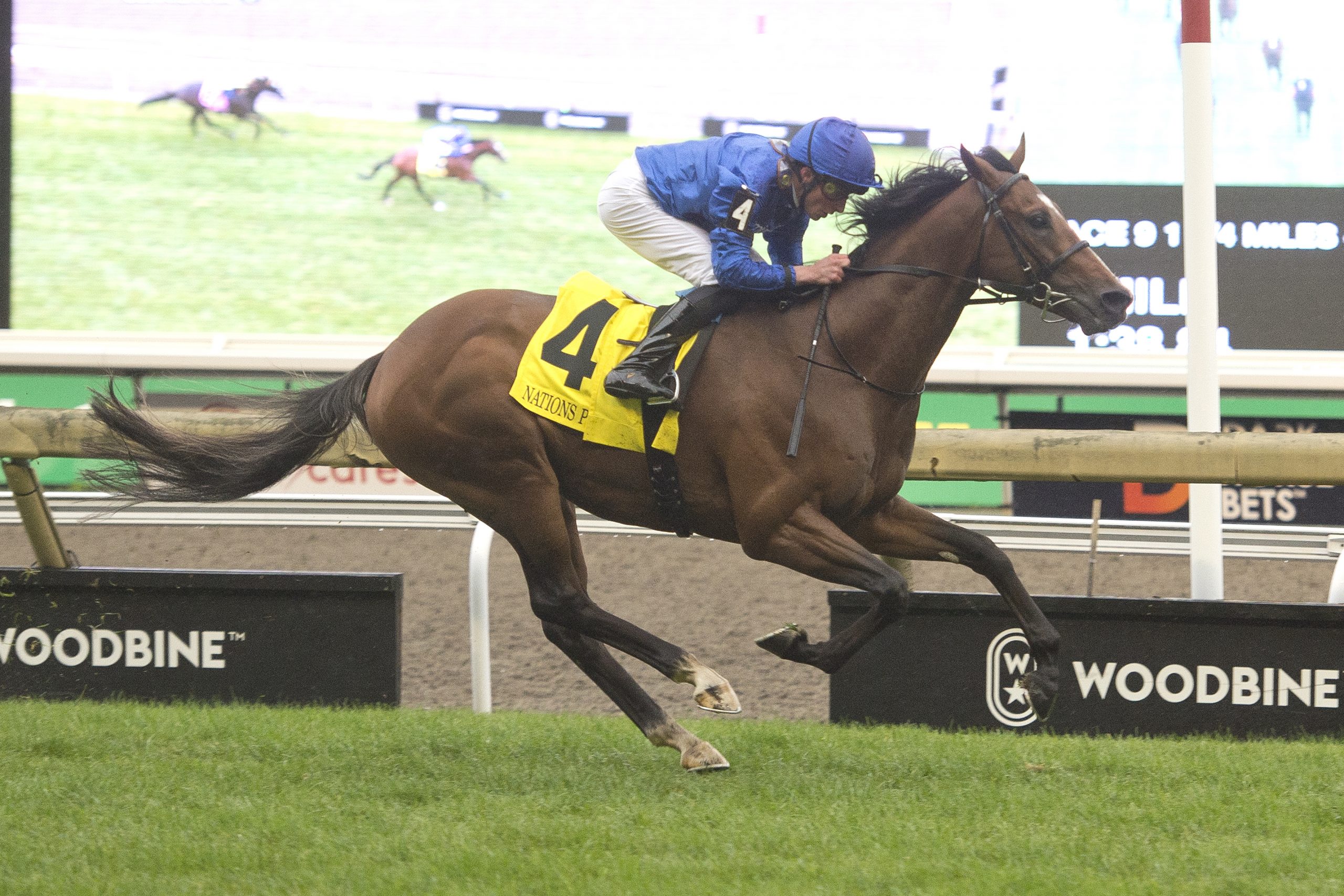 TORONTO, October 8, 2023 – Nations Pride (IRE), sent off as the overwhelming 2-5 choice, reeled in a game Royal Champion (IRE) to win Saturday’s 84th running of the $750,000 Canadian International (G1T) at Woodbine. Royal Champion, under James Doyle, broke swiftly from the outside post eight and glided to the front to seize control of the 1 ¼-mile event for 3-year-olds and upward. Nations Pride, with William Buick in the irons, emerged in second spot into the first turn after leaving a step slowly, followed by longshot duo Starting Over and English Conqueror. Reaching the opening panel in :25.42 over a “yielding” E.P. Taylor turf, Royal Champion was three lengths clear of multiple Group/Grade 1 winner Nations Pride, and then extended that advantage to 3 ½ lengths through a half in :50.07. Nations Pride (IRE) and jockey William Buick winning the 2023 Canadian International at Woodbine (Michael Burns Photo) Royal Champion, who had won the Wolferton Stakes in July at York, continued to canter along on the front end as Buick kept the pacesetter in range into the turn for home. A game Royal Champion then dug in along the rail, but Nations Pride was unrelenting in pursuit. A length behind his rival at the stretch call, Nations Pride rallied smartly to record a 2 ¼-length score in a time of 2:03.65. Royal Champion was second, 7 ¼ lengths ahead of third-place finisher Adhamo (IRE). Palazzi was fourth. English Conqueror, Starting Over, British Royalty and Dynadrive completed the order of finish. Nations Pride, a 4-year-old son of Teofilo (IRE)-Important Time (IRE), whose racing passport includes races in United Arab Emirates, England, and the U.S., was making his first start in Canada. “I’ve ridden in the Canadian International a few times before and I’ve been placed a few times so it’s great to win it,” said Buick. “I knew with Nations Pride I had a pretty good horse so it’s just about getting everything right. The track was a bit of a concern, the yielding surface, but he really showed how versatile he is and he’s a high-class horse.” It was the second straight International crown for owner-breeder Godolphin and trainer Charlie Appleby. In 2021 (the race was paused in 2022 due to travel issues prompted the worldwide pandemic), they sent out Walton Street (GB) (bred by Darley) to victory. Nations Pride came into the International off a victory in the Grosser Dallmayr-Preis – Bayerisches Zuchtrennen (G1T) in Munich on July 30. “The concerns going out was the ground changing to yielding,” said Appleby, in the winner’s circle. “To be fair, in Germany, it was probably on the slower side, but we thought the change might be positive. “James [jockey, Doyle] on the lead horse there, he knows his fractions. If there was one person I wouldn’t have been quite so comfortable with, it was James on the front end. He’s dangerous out there. Turning in, I thought he’s got us. To be fair to William, he had confidence in the horse. The ground unfortunately turning to yielding just took his finishing speed off him. William said his class got him through in the end. “From the horse point of view, we thought the conditions were there to suit him, until the rain came,” continued Appleby. “We seem to have been following the rain the last couple of weeks. It’s a lovely long stretch and something we knew he’d enjoy.” The next engagement for Nations Pride appears to be the $1 million Bahrain Trophy (G2T) on November 17, at 1 ¼ miles. “We’ll stick with plan A,” said Appleby. “We won’t go to the Breeders’ Cup. We don’t think he stretches out that mile and a half, so we’ll take him to Bahrain, and then contemplate if Hong Kong might suit him. But our immediate target will be the Bahrain Trophy.” With the victory, Nations Pride is now 9-2-1 from 14 starts. He paid $2.80 for the win. Chris Lomon, Woodbine Communications / @WoodbineComms Share This:Share