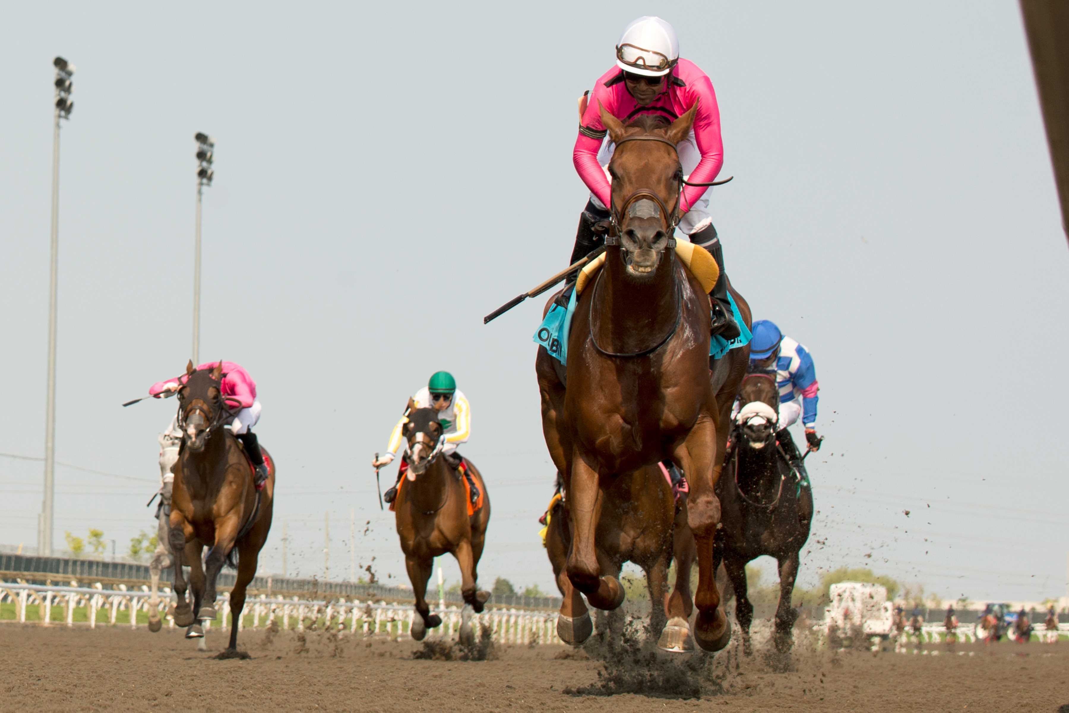 TORONTO, July 27, 2024 – Paramount Prince reigned supreme once again, this time in the $175,000 Seagram Cup (G2), Saturday at Woodbine. Sent off as the 6-5 choice, Paramount Prince, leaving from the outside post in the eight-horse field, was hustled to the front by Patrick Husbands soon after the gates opened in the 1 1/16-mile main track event for 3-year-olds and up. Stanley House settled into second, followed by Volcanic and County Final. On top by two lengths over Stanley House through an opening quarter in :24.69, Paramount Prince held the same advantage after a half reached in :48.81. Heading into the turn for home, Stanley House amped up the pressure to the outside of last year’s King’s Plate winner, but Paramount Prince, under little urging, dashed away from his rivals in early stretch. In front by five lengths at the stretch call, the 4-year-old son of Society’s Chairman-Platinum Steel cruised to a 5 ½-length triumph in a time of 1:43.37. A game Stanley House battled back to finish second, a head in front of Wicked Django. Palazzi, a stablemate of Paramount Prince, was a further neck back in fourth. Money Supply was scratched. Paramount Prince and jockey Patrick Husbands winning the Seagram Cup (G2) on July 27, 2024 at Woodbine (Michael Burns Photo) “He’s having so much fun right now,” said Husbands. “He’s enjoying everything coming over here and he’s growing up, he’s getting bigger and bigger. He’s the type of horse who has got a high cruising speed. He’s just got one ear forward and one ear back. You can play with him, the more you push him the faster he goes. He’s turned out to be a nice horse.” Bred in Ontario by Ericka Rusnak and trained by Mark Casse, Paramount Prince, owned by Gary Barber and Mike Langlois, was a $21,000 (CDN) purchase at the 2021 CTHS sale. Paramount Prince and jockey Patrick Husbands winning the Seagram Cup (G2) on July 27, 2024 at Woodbine (Michael Burns Photo) “I just can’t believe this horse,” said Langlois. “He’s got character, a personality of his own. I love that guy to death. I visit him every week. I talk to him. He’s like a family pet and I think he loves us as much as we love him. “There’s just something about him. He’s an incredible horse. They don’t come like that every day. Being new in the in the race business, I know how lucky we are and how blessed we are to have such an amazing horse.” Paramount Prince, who arrived at the Seagram Cup off his first graded success in the Dominion Day (G3) on June 23, returned $4.50 for Saturday’s victory. The Sovereign Award winner as Canada’s champion 3-year-old male is now 6-2-3 from 12 starts. Chris Lomon, Woodbine Share This:Share