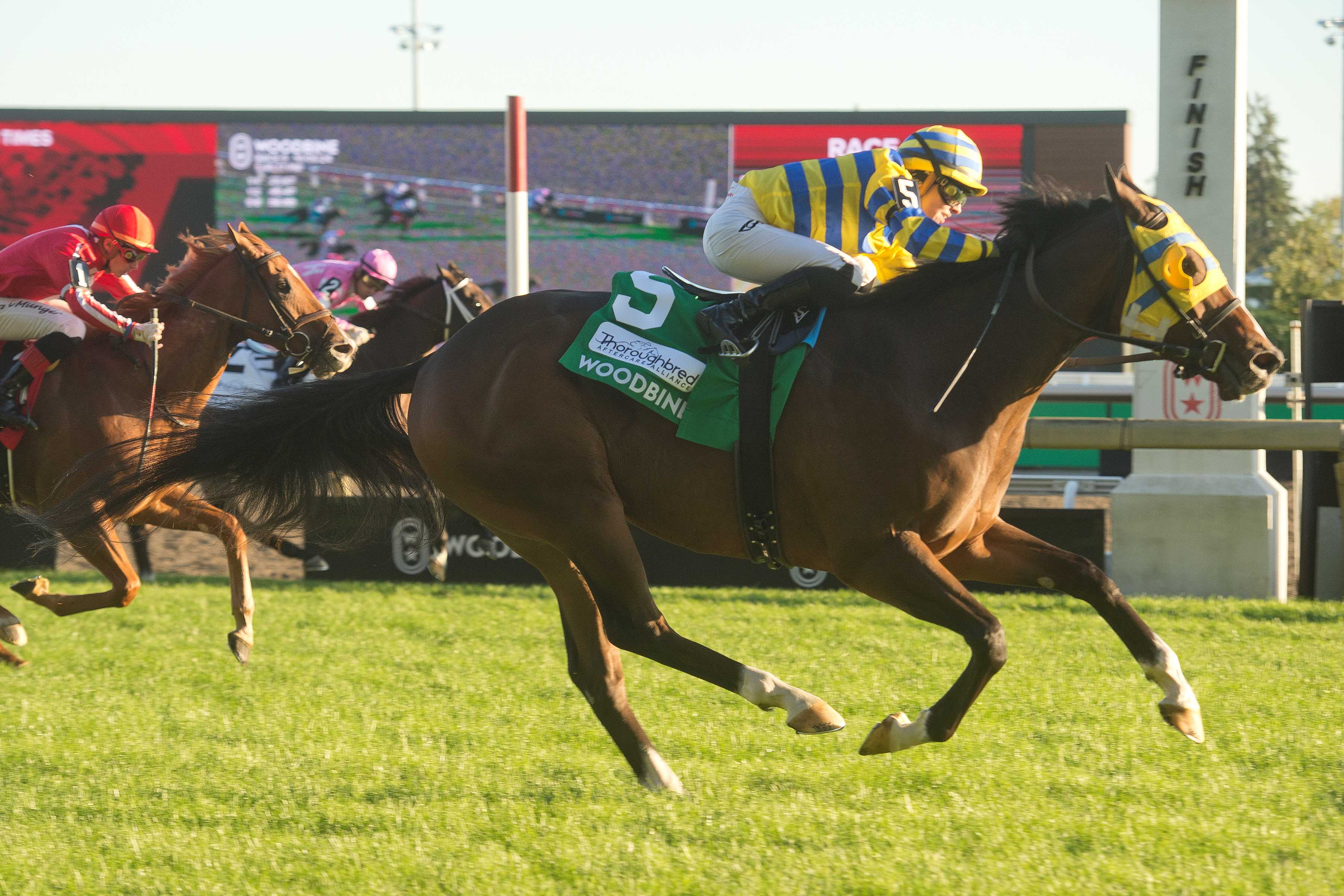 TORONTO, October 5, 2024 – Patches O’Houlihan, with Sofia Vives in the irons, was challenged early, but fought on gamely down the lane to win Grade 2 $250,000 Nearctic Stakes Presented by The Thoroughbred Aftercare Alliance, Saturday at Woodbine. The six-furlong turf stakes for 3-year-olds and upward, attracted a competitive field of 10, including Patches O’Houlihan, Canada’s reigning champion male sprinter. Trained by Robert Tiller for owner and breeder Frank Di Giulio, Jr., the bay gelding once again displayed his grit and gumption, this time on the E.P. Taylor turf. In typical fashion, Patches O’Houlihan broke sharply from the gate, but was immediately engaged by Bring Theband Home, with the duo gaining some separation from their rivals through an opening panel in :22.67 over good going. The pacesetters continued their toe-to-toe tussle into the turn for home with little separating them. Coming off the turn, Patches O’Houlihan and Bring Theband Home were still slugging it out, while Outlaw Kid, second choice on the tote board, commenced a spirited run. Patches O’Houlihan, who had begun to drift out less than 250 yards from the wire, surrendered the lead to rail-riding Outlaw Kid before coming back on to gain the upper hand with less than 100 yards left en route to a 1 ½-length win. Dhabab (IRE) was second, a half-length ahead of War Bomber (IRE), who was a neck in front of Outlaw Kid. The final time was 1:09.49. Patches O’Houlihan and jockey Sofia Vives winning the Nearctic Stakes (G2) on October 5, 2024 at Woodbine (Michael Burns Photo) “It’s very nice to win for this team,” said Vives, Canada’s champion apprentice in 2023. “This horse was really something special today. It was his first time on the grass this year. He ran amazing. I mean, he just shows up every day and gives it his all. No matter what surface, he’s very special. “Every time I ride him, we think maybe we could sit off speed today, but he hears us in the mornings, and he knows he’s faster than everybody, and he’ll prove everybody wrong.” It was the fourth win in as many starts on the campaign for the Ontario-bred, whose 2024 victories include a pair of Grade 3 triumphs, the Bold Venture and Vigil, in his past two engagements. Patches O’Houlihan debuted in September 2022 and recorded a 4 ½-length win at 5 ½ furlongs over Woodbine’s all-weather track. From May 21, 2023, to Sep. 16, 2023, he won six straight races. “He’s a great horse,” praised Di Giulio, who also owned champion sprinter and hall of famer Pink Lloyd. “I love him. Today was a huge thrill and relief more than anything, and he’s right up there with the rest of them. It’s like saying, ‘Which kid do you like better?’ I’m not doing that. He’s wonderful. He’s been a blessing.” With the Nearctic score, Patches O’Houlihan, sired by Reload out of the Silent Name mare Maythefourthbwithu, is now 11-0-0 from 13 starts. He paid $6.30. Chris Lomon, Woodbine Share This:Share