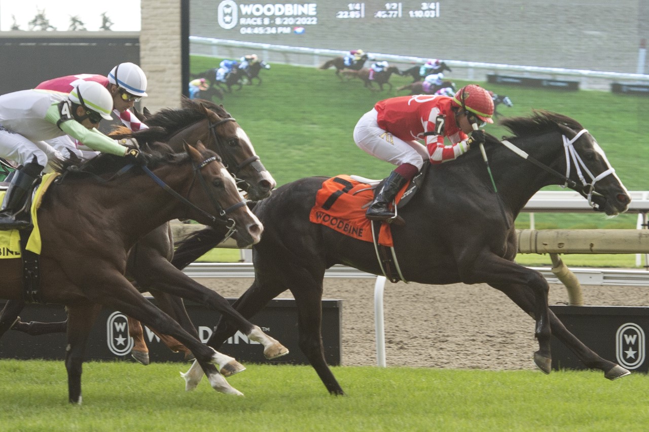 TORONTO, August 20, 2022 – Two-year-olds Philip My Dear and Cairo Consort shared the spotlight on Saturday as Woodbine showcased the $144,300 Soaring Free Stakes and filly companion $132,350 Catch a Glimpse. The 6 ½ furlong sprints contested on the E.P. Taylor Turf Course are local preps for the upcoming Grade 1 Pattison Summer and Johnny Walker Natalma, a pair of Breeders’ Cup ‘Win and You’re In’ one-mile turf stakes set for September 17 at the Toronto oval. Kevin Attard, who will send out star filly Moira in tomorrow’s $1 million Queen’s Plate, will no doubt hope the Soaring Free result is a harbinger of things to come. It was Poulin in O T, undefeated in his first two starts, who sped to the front, as Ninetyfourexpos and outsider Battle Strike kept close tabs on the leader through an opening quarter timed in :22.85. Kazushi Kimura, aboard Philip My Dear, was positioned in eighth of 10 in the early going. Poulin in O T was still on the lead at the half, reached in :45.77, a head in front of a persistent Ninetyfour Expos, with Chiseler now in third. Philip My Dear and jockey Kazushi Kimura winning the Soaring Free Stakes Saturday at Woodbine. (Michael Burns Photo) As the field geared up for the long stretch drive to the wire, Philip My Dear and Kimura (who returned to action after a July spill) had plenty of work to do, sitting eighth at the stretch call in 1:10.03. The pair was able to muscle their way between foes in the late strides and went on to record a three-quarter length win in a time of 1:16.31 over firm ground. Smoke Lightening, at 62-1, was second, while Stayhonor Goodside and Chiseler, finished third and fourth, respectively. The victory was a near carbon copy of the dark bay’s debut on July 3. Eighth of 10 at the half of the 6-furlong turf race, Philip My Dear split foes late to earn a 1 ½ length win. “I didn’t think he was going to make it,” said Attard, of the Soaring Free performance. “He showed a lot of grit and a lot of determination. He’s a nice colt.” A colt that looks to be headed towards a date in the Summer Stakes. “Absolutely,” said Attard. “That’s where we have been aiming for. We kind of thought he might need another race in between his maiden race and the Summer, and that fell today. We’re one step closer.” Rajendra Maharajh, the man behind Raroma Stables, paid $100,000 (U.S.) for the son of Silent Name (JPN)-Involuntary at last year’s Keeneland September Yearling Sale. He was understandably pleased to have purchased the emerging star. “We had to go a little high for him, but that’s how the sale was. But I’m glad we got him. Art Fisher, my very good friend in Ocala, he selected both [2-year-old filly] Courtly Ro and Philip My Dear. He also selected [2021 Woodbine Oaks winner] Munnyfor Ro, so we are doing quite well with his selections.” Munnyfor Ro, who won the 2021 Sovereign Award as Canada’s 3-year-old champion female, will contest the Grade 2 Canadian Stakes Presented by the Japan Racing Association, one of three other stakes races on Sunday’s Queen’s Plate undercard. “I’m hoping we have a good clean run this time and she does what she likes to do,” said Maharajh. Attard, who trains Munnyfor Ro, will look to win his first Plate with 5-2 morning line choice Moira. The daughter of Ghostzapper-Devine Aida will be ridden by Rafael Hernandez. “So far, so good,” said Attard. Philip My Dear paid $4.30 for the win. * Cairo Consort and jockey Leo Salles winning the Catch A Glimpse Stakes on Saturday at Woodbine. (Michael Burns Photo) Cairo Consort, contesting her first stakes race, was full of run along the rail in the stretch, powering to an impressive win in the Catch a Glimpse to notch her second straight score. Grand Oak (IRE) set the early tone, guiding her 11 rivals through an opening panel of :22.87. Antonio Gallardo, aboard Cairo Consort, kept a patient hand aboard the daughter of Cairo Prince-Absolutely Awesome, the duo sitting in seventh after a half in :45.71. As the field came off the turn and straightened for home, Cairo Consort was full of run to the inside and carved out a head advantage at the stretch call, going on to a 2 ½ length score in a time of 1:16.00 over firm ground. Adora was second, Collecting Flatter finished third, with Grand Oak fourth. “Sometimes, you’re the lucky guy,” said Gallardo, who picked up the mount earlier in the day. “I had a really good trip. She’s really honest. Everything worked perfect. I watched the replay [of the filly’s last race] and what the trainer [Nathan Squires] explained to me about her and it’s true, she’s very easy to ride. Whatever position you put her, she stays there, and when it’s time to go or you need a little bit more, you ask her and she gives it to you. That’s pretty cool. It makes my job more easy.” It was a job well done for Squires, who earned his first career stakes triumph. The veteran conditioner had anticipated a strong effort from Cairo Consort, who was bred in Kentucky by Frankfort Park Farm. “Any race is special to win, but when you go to the sales or breed them or you pick them out, or help pick them out, it’s extra special it’s a great feeling.” The grey, owned by William B. Thompson, Jr., is now 2-0-1 from four starts. She broke her maiden in her previous start on July 23. “She was always smart,” offered Squires. “She is getting better and better, and I think she’ll even be a better 3-year-old. We have to [look at running her in the Natalma]. She beat good company here today. I was just looking at her and screaming. Of course, if she’s healthy, we have to look at the Natalma. I think she will fit there.” Sent postward at 9-2, Cairo Consort paid $11.20 for the win. First post for Sunday’s stakes-filled card, headlined by the 163rd running of the Queen’s Plate, is 12:25 p.m. Share This:Share