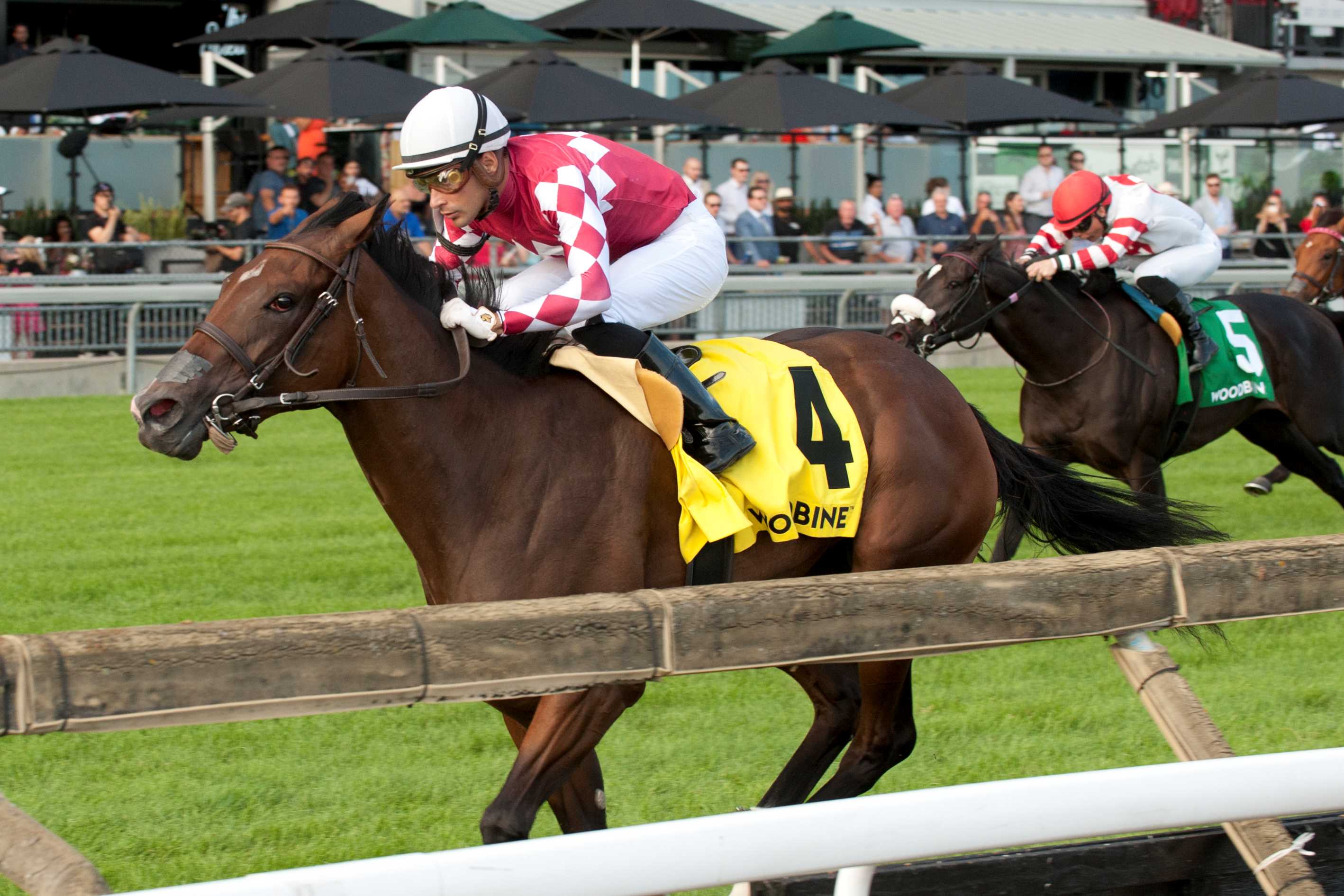 TORONTO, August 23, 2024 – Shifty, making just her second career start, entered Saturday’s Catch a Glimpse Stakes as a decided underdog while facing the likes of her undefeated Mark Casse-trained stablemate Bullet. But, after emerging from a mad scramble to take the early lead, Shifty never looked back as she rolled through fractions of :23.19, :46.20, and 1:09.53, en route to a 3 ¼-length victory in the 6 ½ furlong race for 2-year-old fillies over an E.P. Taylor turf listed as good. Her final time under rider Sahin Civaci was 1:15.68. While Shifty returned $25.50, Casse did not seem overly surprised by her success. Shifty and jockey Sahin Civaci winning the Catch a Glipse Stakes on August 23, 2024 (Michael Burns Photo) “She’s a beautiful filly,” said Casse. “She’s absolutely gorgeous. And we kind of felt like she was as good as anybody. And we wanted to try to get some black type on her, and we got it.” Ready for Candy rallied for second money with Shotgun Wedding, Will Reign (also trained by Casse) and Salt rounding out the top five. Bullet, moving into contention early as the 3-5 choice, was seeking her third win in as many starts but failed to fire and ended sixth in the field of 11. Rounding out the order of finish were Bound to Be True, Ambitious Lass, Carlisle Bay, Crystal Visions and Misty Point. Shifty, owned by D.J. Stable LLC, had debuted on the E.P. Taylor on July 4 and showed late life to finish fifth in a field of seven after breaking slowly. By Medaglia d’Oro out of the Elusive Quality mare Elusive Luci, Shifty was bred by Anderson Farm Ontario Inc. and sold for $350,000 at last year’s Fasig-Tipton Kentucky sale. Bill Tallon, for Woodbine Communications Share This:Share