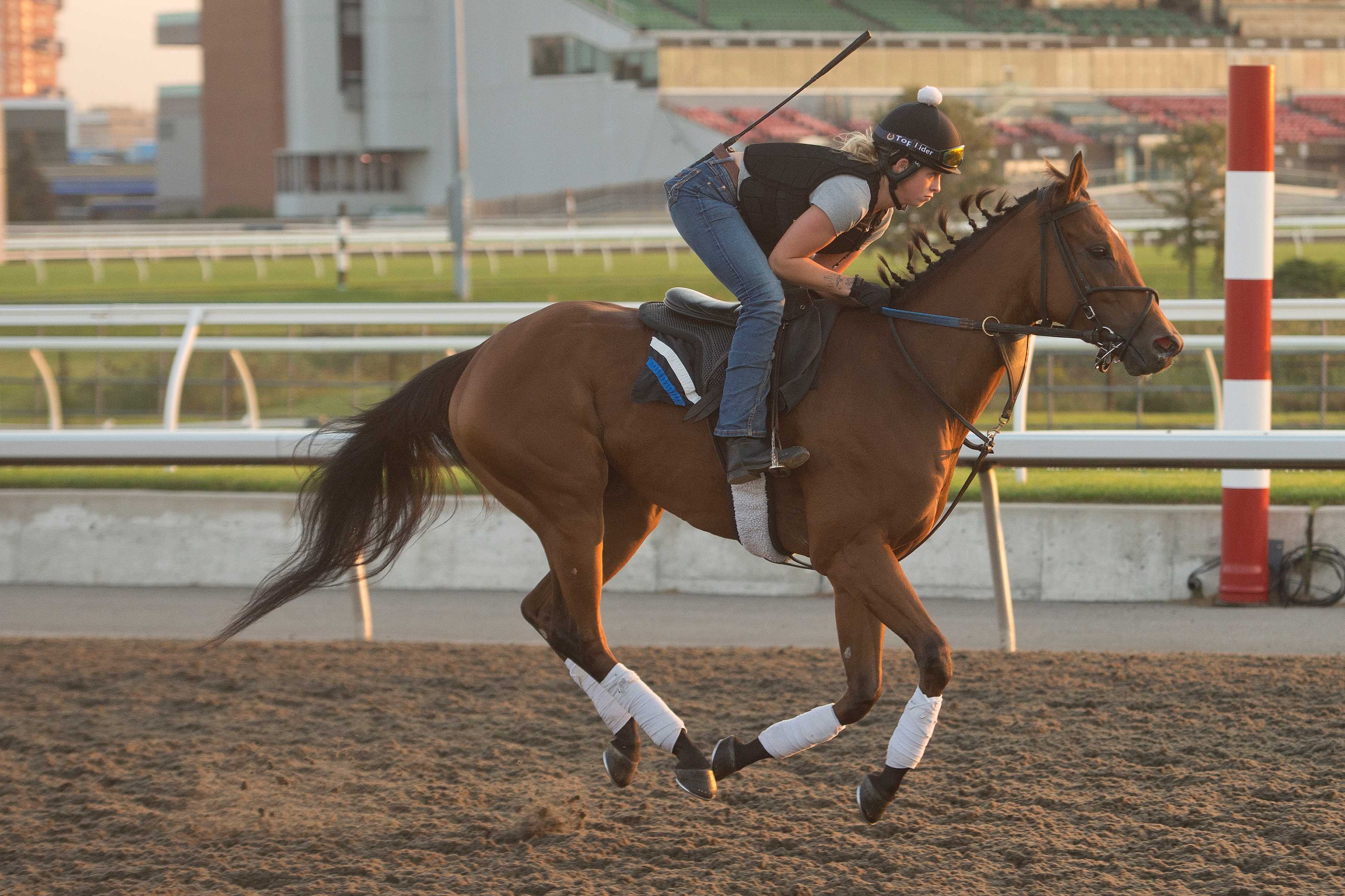 TORONTO, September 5, 2024 – This year’s edition of the Canadian Triple Tiara concludes with Sunday’s running of the $250,000 Wonder Where Stakes, at Woodbine. Set for 1 ¼ miles on the E.P. Taylor turf, the Wonder Where, for 3-year-old Canadian-bred fillies, drew seven starters, including a pair of Chiefswood Stables’ homebreds, Quality Presence and Saccharine. A daughter of Quality Road-Ghostly Presence, Quality Presence has a pair of thirds – coming in her past two starts – from seven races. Quality Presence training at Woodbine (Michael Burns Photo) Trained by Canadian Horse Racing Hall of Fame inductee Josie Carroll, the bay, who launched her career with back-to-back fifths over the E.P. Taylor course last August and September, has put together two solid outings leading into the Wonder Where. On August 3, Quality Presence finished a game third, missing top prize by a length in the ‘about’ 1 1/8-mile race on the E.P. Taylor. “She will get the distance, I am confident both her and Saccharine will,” said Robert Landry, Chiefswood’s general manager, who won 2,045 races over his Hall of Fame riding career. “You can see that Quality Presence is starting to hit her best stride. “This filly has put together two nice races in a row and is certainly heading in a good direction.” As is Saccharine. Saccharine training at Woodbine (Michael Burns Photo) Last time out, under apprentice Pietro Moran, who will ride again on Sunday, the daughter of Noble Mission (GB)-Niigon’s Legacy rallied stoutly to finish second in the same race as her stablemate Quality Presence. After an awkward break, Saccharine regrouped and moved into fifth at the stretch call before closing to miss by a half-length. “Rachel [trainer, Halden] had planned for a while that this horse would run in the Wonder Where because it is a race that this horse is made for,” said Landry. “She has run too many good races not to give it a go.” The bay was fifth in her debut last September, and sixth in her next two starts, before a troubled ninth in her fourth test. Saccharine, 0-3-0 from seven starts, started her current string of strong efforts on June 1 when was second, at 21-1, in a 1 1/16-mile race over the Woodbine all-weather track. “Those past three starts have been very good,” said Landry. “Maybe with a little luck, some of those could have been wins, but she is learning and getting better and better.” The Wonder Where will mark the first stakes engagement for the Chiefswood sophomores. “I get to see them from a young age,” said Landry. “We could see that they had ability early, but a lot of our families take a while to develop. Right now, it seems like things are on the right track. “Rachel and Josie have both done a very good job with these fillies, and hopefully, we get to have a nice outcome on Sunday.” Kevin Hornsburger is the groom of Quality Presence. Mary-Anne Baumgartner is the groom of Saccharine. The race is named after champion filly Wonder Where, Canada’s 1959 Horse of the Year and Canadian Horse Racing Hall of Fame inductee. Kin’s Concerto, a Chiefswood Stables homebred, won this year’s Woodbine Oaks Presented by Stella Artois. Stormcast, trained by Mark Casse for K E M Racing Stable (who will contest the Wonder Where), took the second jewel of the Triple Tiara, the Bison City, on August 10. Sealy Hill, Canada’s Horse of the Year in 2007, took all three Triple Tiara races in that same year. First post on Sunday’s 10-race card is 1:05 p.m. Fans can wager on all the action via HPIbet.com and bet365.com. $250,000 Wonder Where Stakes (Race 9) Post – Horse – Jockey – Trainer 1 – A Little Frisky – Justin Stein – Josie Carroll 2 – Saccharine – Pietro Moran – Rachel Halden 3 – Quality Presence – Luis Contreras – Josie Carroll 4 – Vucchella – Rafael Hernandez – Kevin Attard 5 – My Girl Della – Jose Campos – Kevin Attard 6 – Stormcast – Patrick Husbands – Mark Casse 7 – Hurricane Clair – Sahin Civaci – Martin Drexler Chris Lomon, Woodbine Share This:Share