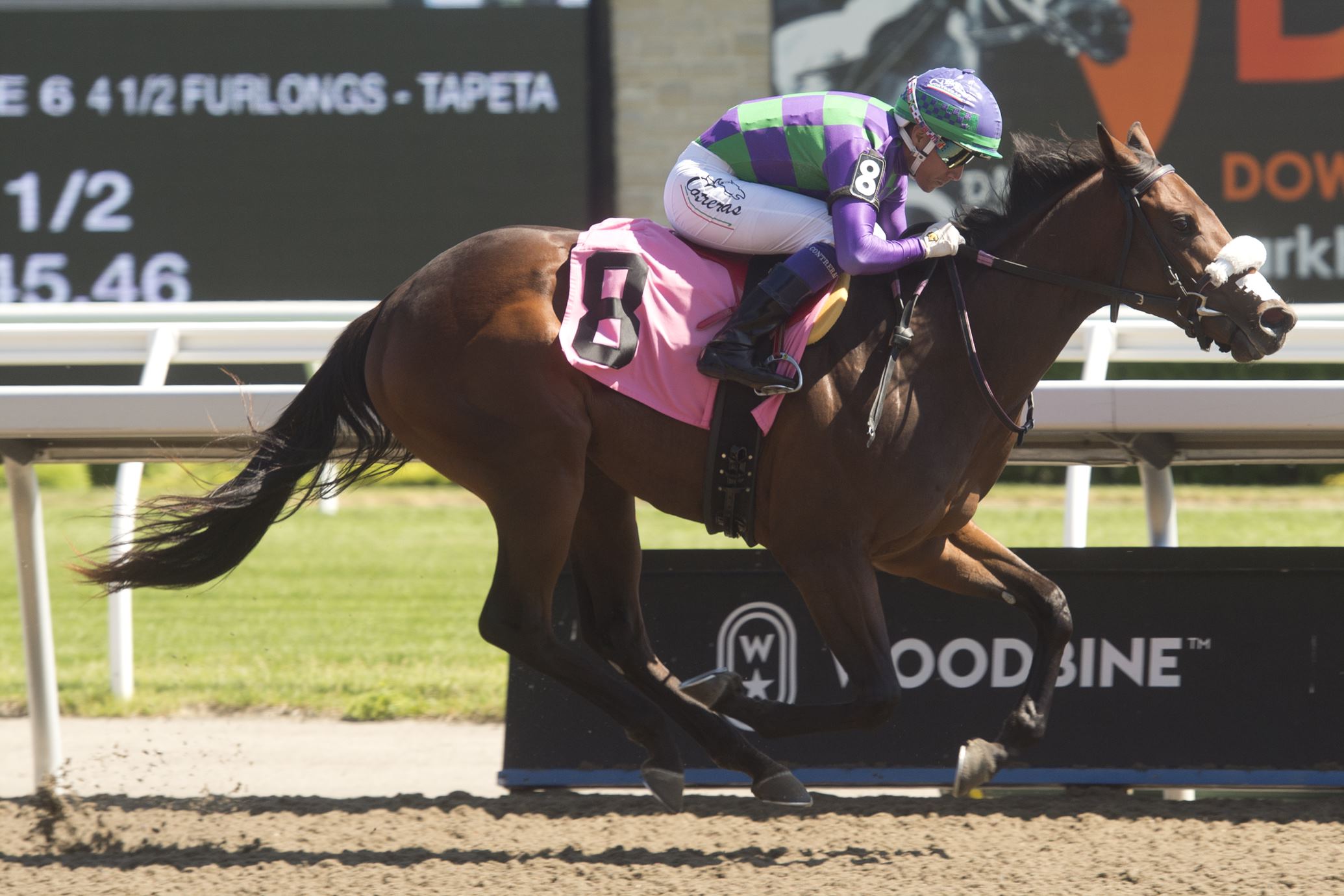 TORONTO, July 13, 2022 – An opportunity at early stakes glory will be up for grabs in Saturday’s $125,000 My Dear Stakes for two-year-old fillies at Woodbine Racetrack. A field of five will travel 5 ½ furlongs on the Woodbine Tapeta in Saturday’s feature race. All but one of the competitors has made their pari-mutuel debut, including Mike De Paulo trainee Speedy River, who won her debut by 3 ½ lengths on June 18 over the Woodbine Tapeta. “She ran a real good race. She’s very quick,” said De Paulo of Speedy River. “Mike Cook (Classic Mile) had her in Florida and sent her up to us in great shape and it’s been onwards and upwards from there.” Leaving from post four in Saturday’s $125,000 event, Speedy River will look for an encore of her June 18 effort. The youngster has shown her trainer quickly that she knows when the money is on the line. “Her works were pretty decent ahead of that first race,” noted De Paulo. “It’s funny because I worked her with a couple of others, and she finished third, but she was the one that won.” Speedy River and Luis Contreras will look to duplicate their victory from June 18 (pictured) in Saturday’s My Dear Stakes. (Michael Burns photo) A daughter of Souper Speedy, Speedy River was bred by Tall Oaks Farm and races for its owner Ivan Dalos. Luis Contreras will again be in the irons for Saturday’s bout. All four fillies in the My Dear with at least a start under their belt have already visited the winner’s circle, which sets up an intriguing matchup. De Paulo is pleased with Speedy River heading into Saturday’s race and knows she will bring a loud effort, even if that’s not her style in the barn. “You wouldn’t know she’s in the barn. She just does her own thing,” remarked De Paulo. “She had a nice breeze the other day. She’s got some pump, that’s for sure. She tries.” The My Dear is slated as Race 8 on Saturday’s ten-race card. First post time is 1:00 p.m. Fans can watch and wager on all the action via HPIbet.com or the Dark Horse Bets app. The field for the My Dear Stakes is listed below: POST – HORSE – JOCKEY – TRAINER 1 – State of Mind – Rafael Hernandez – Josie Carroll 2 – Damaso – Pablos Morales – Tim Hamm 3 – Collecting Flatter – Kazushi Kimura – Josie Carroll 4 – Speedy River – Luis Contreras – Mike De Paulo 5 – Cahira’s Blessing – Declan Carroll – Mark Casse Share This:Share
