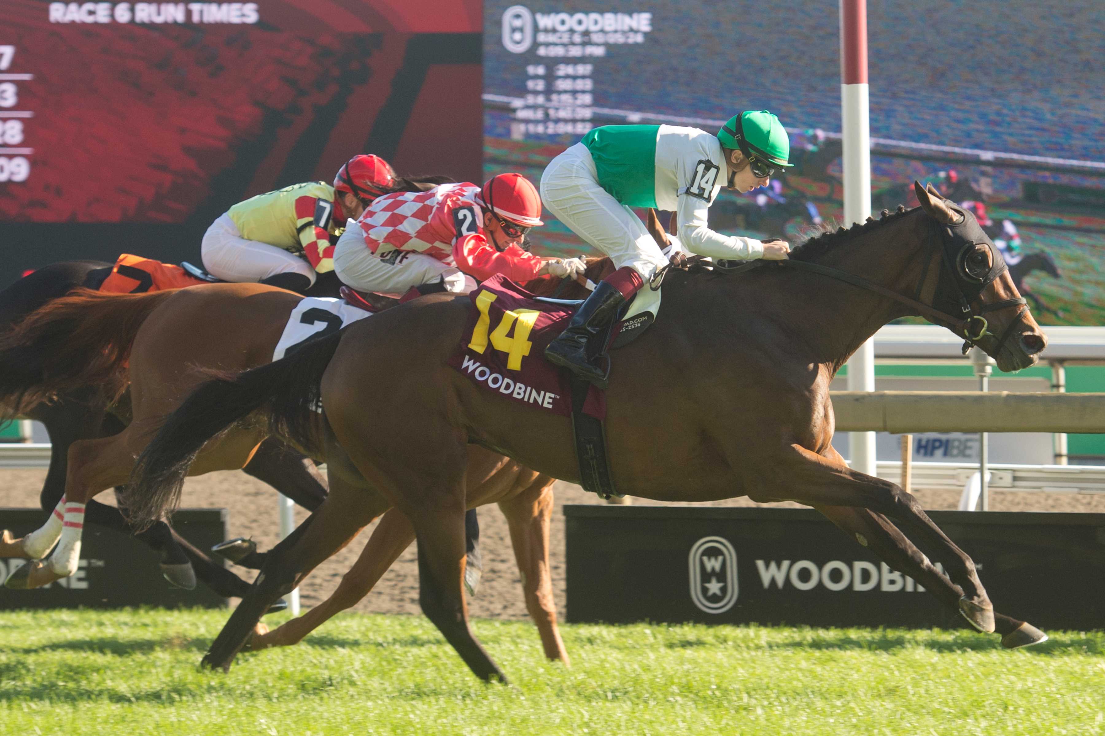 TORONTO, October 5, 2024 – Truly Quality, rallying from well back after breaking from the outside post in the field of 13 under rider Vincent Cheminaud, was along in time for a three-quarter length victory in an exciting running of Saturday’s $175,000 HPIbet Singspiel Stakes (G3T) at Woodbine. A homebred racing for George Strawbridge, Jr.’s Augustin Stable and trained by Jonathan Thomas, Truly Quality was making his graded stakes debut in the Singspiel but was the 9-5 favourite on the strength of his excellent current form capped out by a last-out victory in the 1 ½ mile Colonial Cup over 1 ½ miles of firm going at Colonial Downs. “I had a bad draw today, so he was very lazy,” said Cheminaud. “When I pushed him a little bit, he gave me a good answer and took the beat for the end. He’s a nice horse. He was the best today.” Eyes On the King, breaking from post 11, assumed command early in the Singspiel and led the field through fractions of :24.97, :50.03, 1:15.28 and 1:40.09 with last-out Niagara Stakes winner Lac Macaza pressing just outside. Highland Chief (IRE), Stone Age (IRE), Dancin in Da’nile and English Conqueror were all beginning to launch their bids around the final turn, however, and with a furlong to run it was Highland Chief in front by a head following an inside trip. Truly Quality had found his best stride by this point and simply was too much for his game rivals. English Conqueror prevailed in the battle for second money, ending a half-length to the good of Stone Age. Dancing in Da’nile finished another 1 ½ lengths back in fourth, edging Highland Chief by a head as the winner stopped the clock in :2:17.47. Truly Quality and jockey Vincent Cheminaud winning the HPIbet Singspiel Stakes (G3) on October 5, 2024 at Woodbine (Michael Burns Photo) Lac Macaza finished sixth with Eyes On the King, Palazzi, Like the King, Spinzar, Eldon’s Prince, Dun Drum and Malibu Mambo completed the order of finish. Palazzi, the defending champion in the Singspiel, took late money and went off as the second choice at 7-2. Loose Wire was scratched. Truly Quality, a Kentucky-bred 4-year-old gelding by Quality Road out of the Smart Strike mare, Truly Together, now has won four of 12 outings while finishing off the board only once. Truly Quality and jockey Vincent Cheminaud winning the HPIbet Singspiel Stakes (G3) on October 5, 2024 at Woodbine (Michael Burns Photo) Thomas, who also saddled 2021 Singspiel winner Corelli, lauded Truly Quality’s performance. “We threw out the game plan because, it depended on how he broke,” said Thomas. “But I will say I was concerned about 90 percent of the race, but Vincent did a good job of not panicking, breaking a little slow, letting him gather some steam. I thought the horse overcame a pretty, pretty tough situation. “I’d love to talk to the Strawbridges about maybe taking a real swing and going to Breeders’ Cup and then giving him the winter off and really trying to make him a Grade 1 horse.” Bill Tallon, for Woodbine Communications Share This:Share