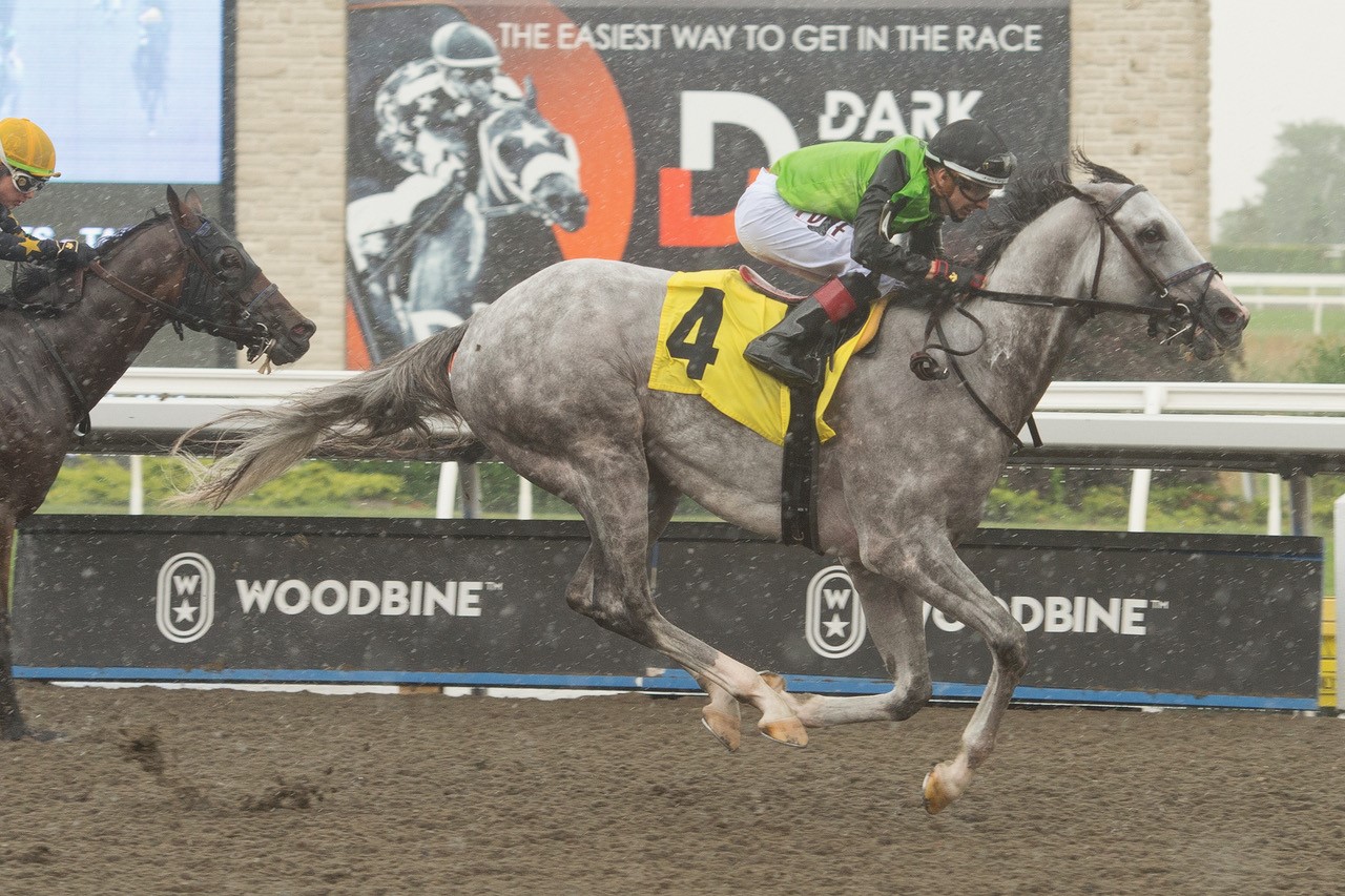 TORONTO, July 1, 2023 – Canadian Horse Racing Hall of Fame trainer Josie Carroll delivered a one-two punch with winner Tyson and runner-up Treason in the $150,000 Dominion Day Stakes (G3), on Canada Day Saturday at Woodbine. Last time out, Tyson finished third to stablemate Treason in the Eclipse Stakes (G2). On this day, the tables were turned in the 1 1/8-mile main track feature for 4-year-olds and up. Graded stakes winner War Bomber (IRE) left from the inside gate, but drifted over to the middle of the Tapeta, with Carrothers and Artie’s Storm sitting second and third, respectively, through an opening quarter in :23.73, as Tyson sat sixth of nine. Carrothers was a head in front of War Bomber (IRE), with Duke of Love third after a half in :47.63, while Rafael Hernandez kept a patient hand aboard Tyson, who was seventh. As the field came off the turn for home, Treason shook loose and stormed to the front, but Tyson was also rolling to the far outside, and the pair locked horns down the lane with Tyson eventually getting by a determined Treason to earn a 1 ½-length triumph in a time of 1:48.32, just a shade off the track-record mark of 1:48.24 set by Global Access in 2019. Tyson and jockey Rafael Hernandez winning the Dominion Day Stakes on July 1, 2023 at Woodbine (Michael Burns Photo) Gaston was third, followed by War Bomber (IRE), Artie’s Storm, Golden Glider, Duke of Love, Novo Sol (BRZ) and Carrothers. Carroll, who won the 2021 edition of the Dominion Day with two-time Canadian Horse of the Year Mighty Heart, gave full marks to Tyson. “Tough trip for a great big horse,” said Carroll. “He’s got a great big, long stride of a horse. He’s in tight, he’s in trouble, he’s getting shuffled around, he just keeps sitting and sitting until he can get him out of there. Everything that could go wrong with him went wrong.” Bred and owned by Hill ‘n’ Dale Equine Holdings Inc., and Stretch Run Ventures, LLC, the lightly-raced 4-year-old son of Tapit-Honouring is now 3-0-1 from four career starts. The Kentucky-bred colt won his first two starts, including his career bow on March 4, 2022, over 1 1/16 miles on the Gulfstream main track. “When he got out [today], he just fired,” praised Carroll. “He was closing strongly in his last stakes, and I really expected a big race from him today. He’s been waiting for the chance to use that big stride and he just takes off.” Tyson returned $10.30 for the Dominion Day win. Chris Lomon, Woodbine Communications / @WoodbineComms Share This:Share