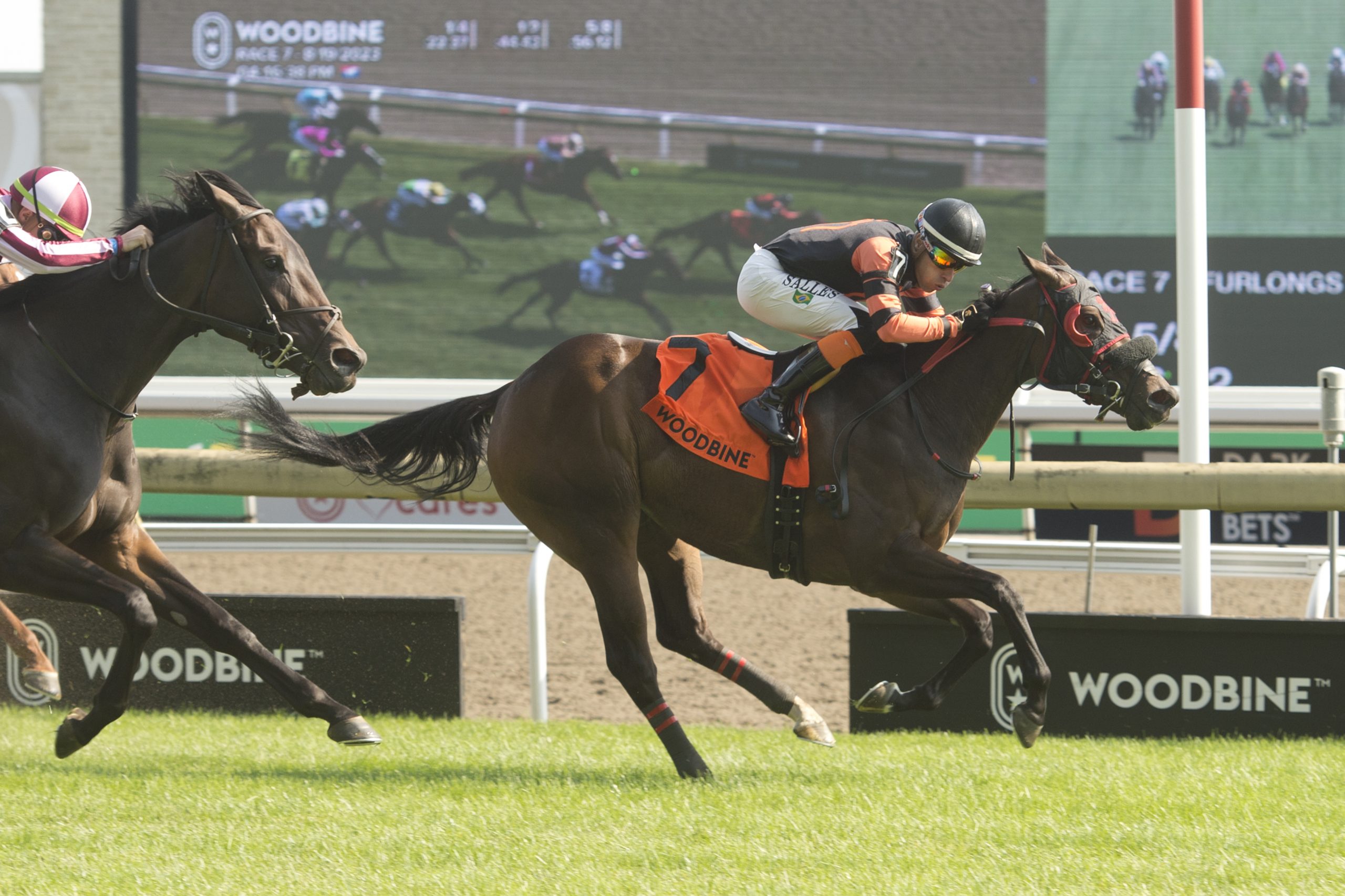 TORONTO, August 19, 2023 – Canadiansweetheart, at 36-1, rallied impressively to take Saturday’s $125,000 Sweet Briar Too Stakes at Woodbine. The trio of trainer Renico Lafond, jockey Leo Salles and owner Kris Manohar will team up with longshot Morstachy’s in Sunday’s running of the 164th King’s Plate. On Saturday afternoon, they combined for a sweet surprise score with outsider Canadiansweetheart. Forest Drift broke alertly and eventually struck front with 3-5 choice Clitheroe (GB) and Run for the Hills pressing the leader, as Salles and Canadiansweetheart sat fourth through an opening quarter in :22.37. Just ahead of the half (reached in :44.43), Forest Drift was overtaken by Clitheroe (GB) and Run for the Hills, as Salles positioned Canadiansweetheart for her best run. Midway down the lane, the longest shot on the board was quickly gaining ground on the frontrunners. Canadiansweetheart wore down her rivals and went on to record a three-quarter length triumph in a time of 1:08.68 over “firm” going. A fast-closing 13-1 Talk to Ya Later rallied for second, 1 ¼ lengths ahead of Clitheroe (GB). Hard Edge, who had to check along the backstretch, finished fourth. “Everything worked out good,” said Salles. “I breezed her and she came ready to race. We got a perfect trip. I came outside and when I asked her, she had a good turn of foot.” A 3-year-old daughter of Ransom The Moon-Terri’s Pass, the dark bay is now 5-0-1 from seven starts on the year and 8-0-2 from 17 career races. Canadian Sweetheart and jockey Leo Salles winning the Sweet Briar Too stakes on August 19, 2023 at Woodbine (Michael Burns Photo) It was also the first stakes victory for Canadiansweetheart, whose only other stakes appearance came in the Fury Stakes in June when she was seventh. Lafond, whose other stakes victory came in the 2012 Ruling Angel with Silent Serenity, praised his filly’s huge performance. “When I first got her, she was very, very hyper,” said Lafond, who claimed Canadiansweetheart this spring for $25,000. “I had to get to relax a little bit. I accomplished that part, getting her to learn to relax and chill, and I thought she would go long, but she gets tired. I will try it later on, but not now. I’m quite happy. We did it. Here we are. I hope tomorrow is the same result.” Added Manohar, “She always gives us 100 per cent when she runs. She has such a big heart. She’s just like us. We’re underdogs, we’re young and we’re trying. Today, she proved the underdog can always win too.” On Sunday, the connections will look to duplicate that success in the King’s Plate with Morstachy’s. “We are the same team and I think we are going into the race with a little luck,” offered Salles. Canadiansweetheart paid $75.70. War Bomber (IRE) impressive in Grade 2 King Edward Stakes TORONTO, August 19, 2023 – Irish-bred War Bomber struck front in early stretch and then held off a game Treason to take Saturday’s $200,000 King Edward Stakes (G2T) at Woodbine. A one-mile turf race for 3-year-olds and upward, the King Edward went postward with nine starters after the scratches of Town Cruise and Haddassah. Treason, the 5-2 second choice, was sent to the front by leading rider Kazushi Kimura, as Rico Walcott and War Bomber patiently tracked the pacesetter from in second, followed by the duo of Shirl’s Speight and The Minkster. Ahead 2 ½ lengths after an opening panel in :23.53, Treason extended that advantage over War Bomber to three lengths through a half in :45.63. Still well ahead of their rivals as they rounded the turn for home, multiple stakes-winning War Bomber came calling to Treason’s outside, setting the stage for a thrilling stretch duel. After powering by Treason past the three-sixteenths, War Bomber appeared en route to a comfortable win, but the former fought back along the inside in the final strides. At the finish, War Bomber was a neck in front. Lucky Score was third and multiple graded stakes winner, 9-5 choice Shirl’s Speight, was fourth. The final time over “firm” ground was 1:32.41. War Bomber (IRE) and jockey Rico Walcott winning the King Edward Stakes on August 19, 2023 (Michael Burns Photo) “I was going to play it by the break,” said Walcott, who will ride Kaukokaipuu in tomorrow’s King’s Plate. “I break on top and then I see another horse (Treason) want to go for the lead, so I just take my horse back a little and sit behind the speed and just wait for the right time to move. At the head of the lane when I asked him, he gave me all he had. It was a good finish. I enjoy it when I cross the line first.” It was the seventh win from 19 starts for War Bomber, the 5-year-old son of War Front-Sun Shower (IRE), whose victories include last year’s Seagram Cup (G3). Bred by Coolmore, the bay gelding is trained by Norm McKnight. “He’s versatile,” said Bruno Schickedanz, Canada’s champion owner of 2022. “To me, I don’t know where he’s better. He’s good on both surfaces.” War Bomber, who contested last year’s Ricoh Woodbine Mile (G1T), could take another shot at the $1 million turf classic on September 16 at Woodbine. “Who knows? We’ll talk about it and think about it,” offered Schickedanz. War Bomber returned $14.90 for the win. Chris Lomon, Woodbine Communications / @WoodbineComms Share This:Share