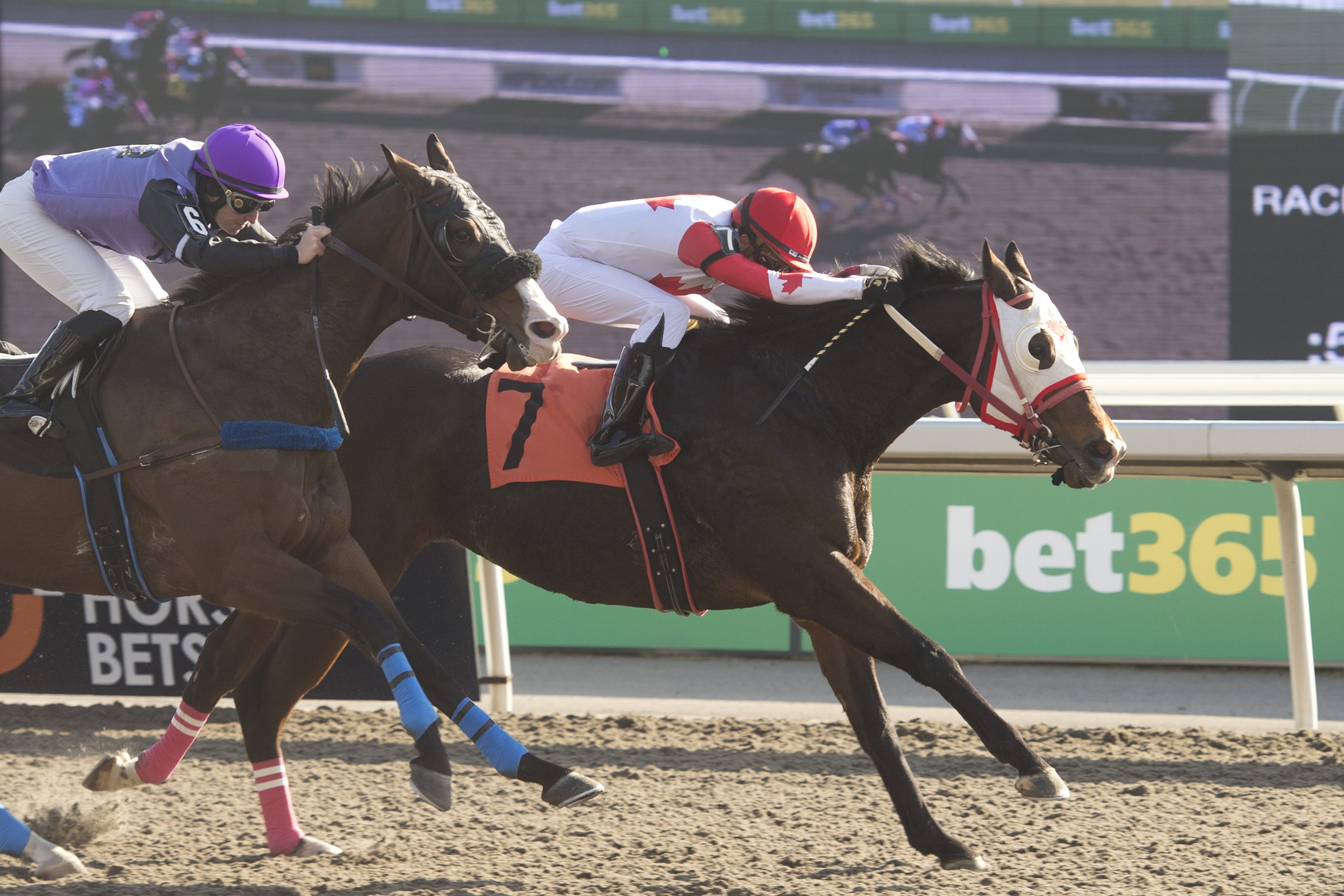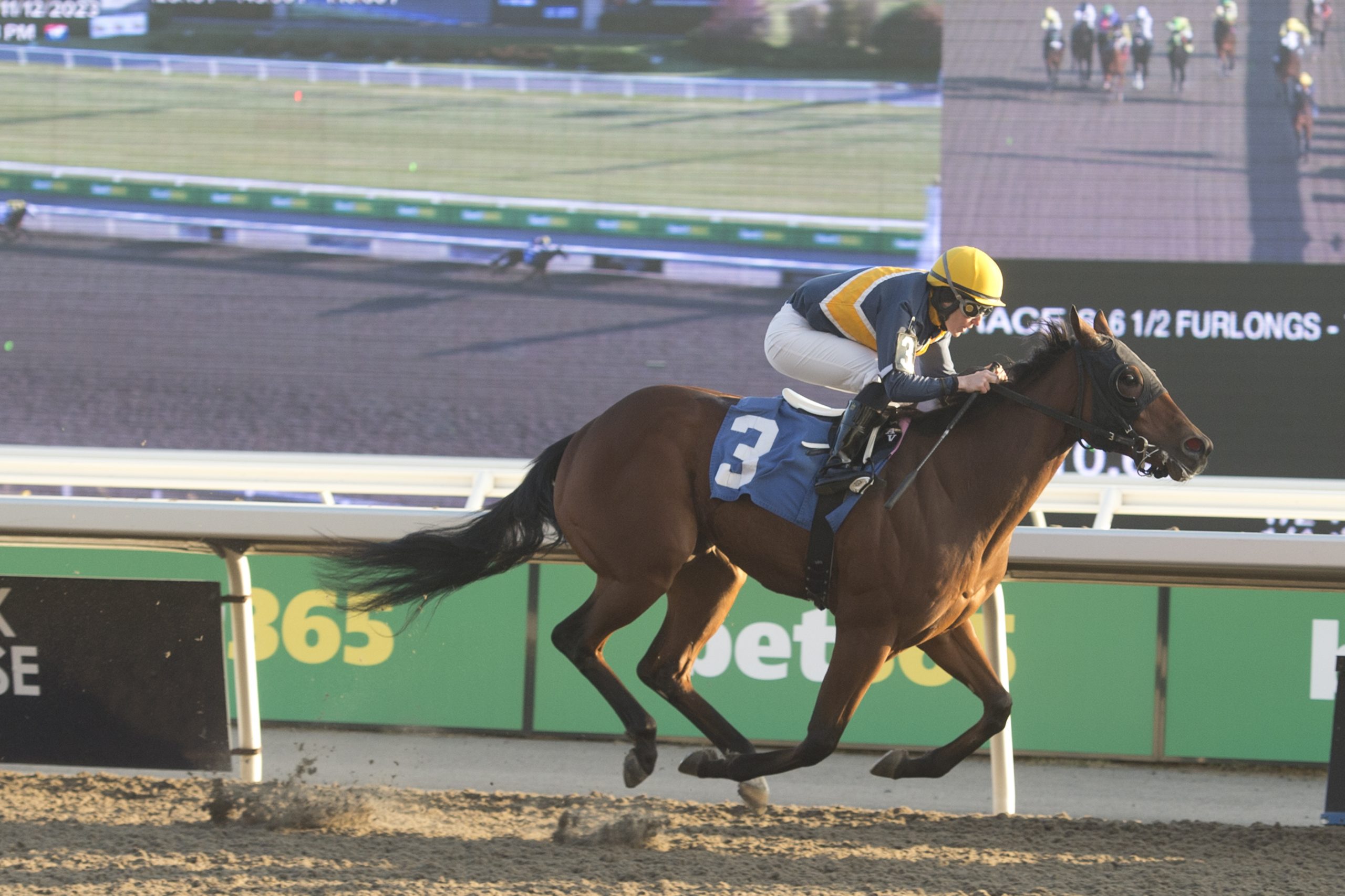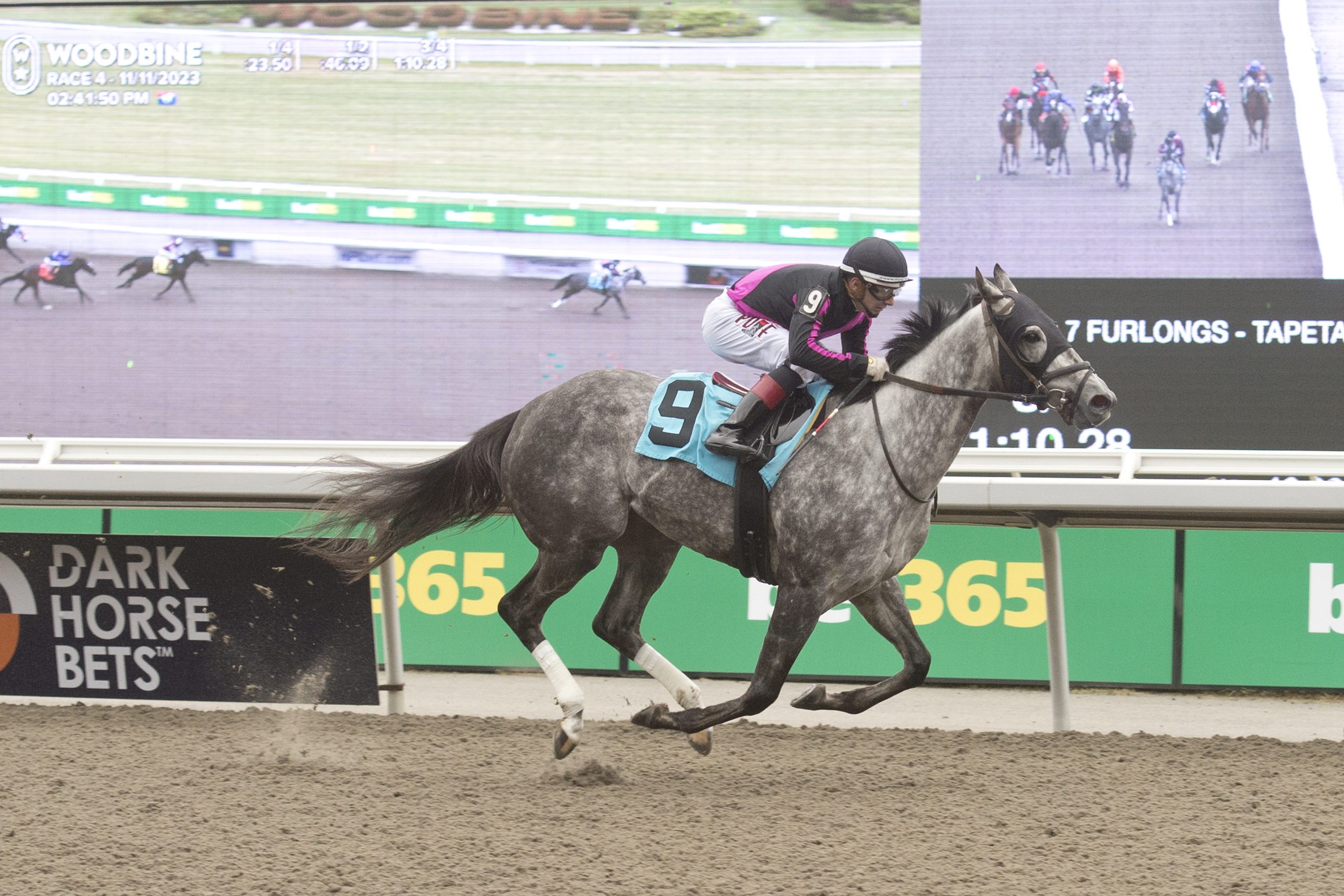 A Raffi hatty Jockey Rafael Hernandez netted the natural hat trick on Saturday, winning the second race with Kitten’s Romance, the third with Pleasure’s Gold and the fourth with Silken Dollar. A 20-cent Hernandez Pick 3 returned $38.89. The veteran rider is closing in on 3,070 career wins and has recorded 148 stakes victories. Silken Dollar and jockey Rafael Hernandez winning Race 4 on November 11, 2023 at Woodbine (Michael Burns Photo) Millie Girl power Millie Girl, trained and co-owned by Catherine Day Phillips, won her second straight graded race on Saturday. With Rafael Hernandez in the irons, the 5-year-old daughter of Hard Spun-Mendocino Beano rallied from well back to take the $150,000 Maple Leaf Stakes (G3), at 1 ¼ miles on the Tapeta. One race earlier, the dark bay mare, bred in Ontario by Sean Fitzhenry, took the Ontario Matron (G3). Millie Girl and jockey Rafael Hernandez winning the Maple Leaf Stakes on November 11, 2023 at Woodbine (Michael Burns Photo) Longshot special Little Teddy, a 2-year-old daughter of Frac Daddy-Explosive Leah, went off at 48-1 in Saturday’s last race, a 6 ½-furlong race over the Tapeta for maiden 2-year-old fillies. After being bumped by a rival at the start, the Santino Di Paola trainee recovered and went on to cross the wire a half-length winner. A $2 win bet returned $98.10. Little Teddy and jockey Alexander Marti winning Race 11 on November 11, 2023 at Woodbine (Michael Burns Photo) Holding Court On Sunday, in the sixth race, Gun Court, sent off as the 7-2 third choice in the field of 10, got away fourth at the start of the 6 ½-furlong Tapeta race for 2-year-olds. The son of Souper Speedy-Civic Duty then set the pace between runners and held a 2 ½-length lead at the half-mile mark. On top by five lengths at the stretch call, the bay gelding widened his advantage at will, crossing the wire a 9 ¾-length winner. Gun Court and jockey Amanda Vandermeersch winning Race 6 on November 12, 2023 at Woodbine (Michael Burns Photo) Big-time rush Apprentice jockey Austin Adams won his first career race on Sunday. Teaming with Big Time Louie, a 6-year-old dark bay son of Second in Command-Danny’s Chant, the pair won the 5 ½-furlong main track race by a half-length. The British Columbia-bred bay returned $38.30 for a $2 win bet. Big Time Louie and jockey Austin Adams winning Race 2 on November 12, 2023 at Woodbine (Michael Burns Photo) Worth hearing “She’s such a special filly, she’s a little quirky as you could see. She behaved better today in the winner’s circle but then had enough. When she’s had enough, she’s had enough. She’s very strong-willed.” – Catherine Day Phillips, after Millie Girl won Saturday’s Maple Leaf Stakes (G3) Worth watching Loyalty, sent off as the slight 3-1 choice in Saturday’s $175,000 Bessarabian Stakes (G2), rocketed home to take top prize in the seven-furlong main track tilt for fillies and mares, 3-year-olds and up. Owned by Gainesway Stable and LNJ Foxwoods, the Florida-bred daughter of Hard Spun-Slew’s Quality is now 7-0-2 from 11 career starts. Worth knowing The $175,000 Kennedy Road Stakes (G2) will see 3-year-olds and up tackle six furlongs on the Tapeta this Saturday. Hall of Fame champion Pink Lloyd won the race on three occasions. Candy Overload, under Sahin Civaci, took last year’s running. https://woodbine.com/stakes-schedule/ Share This:Share