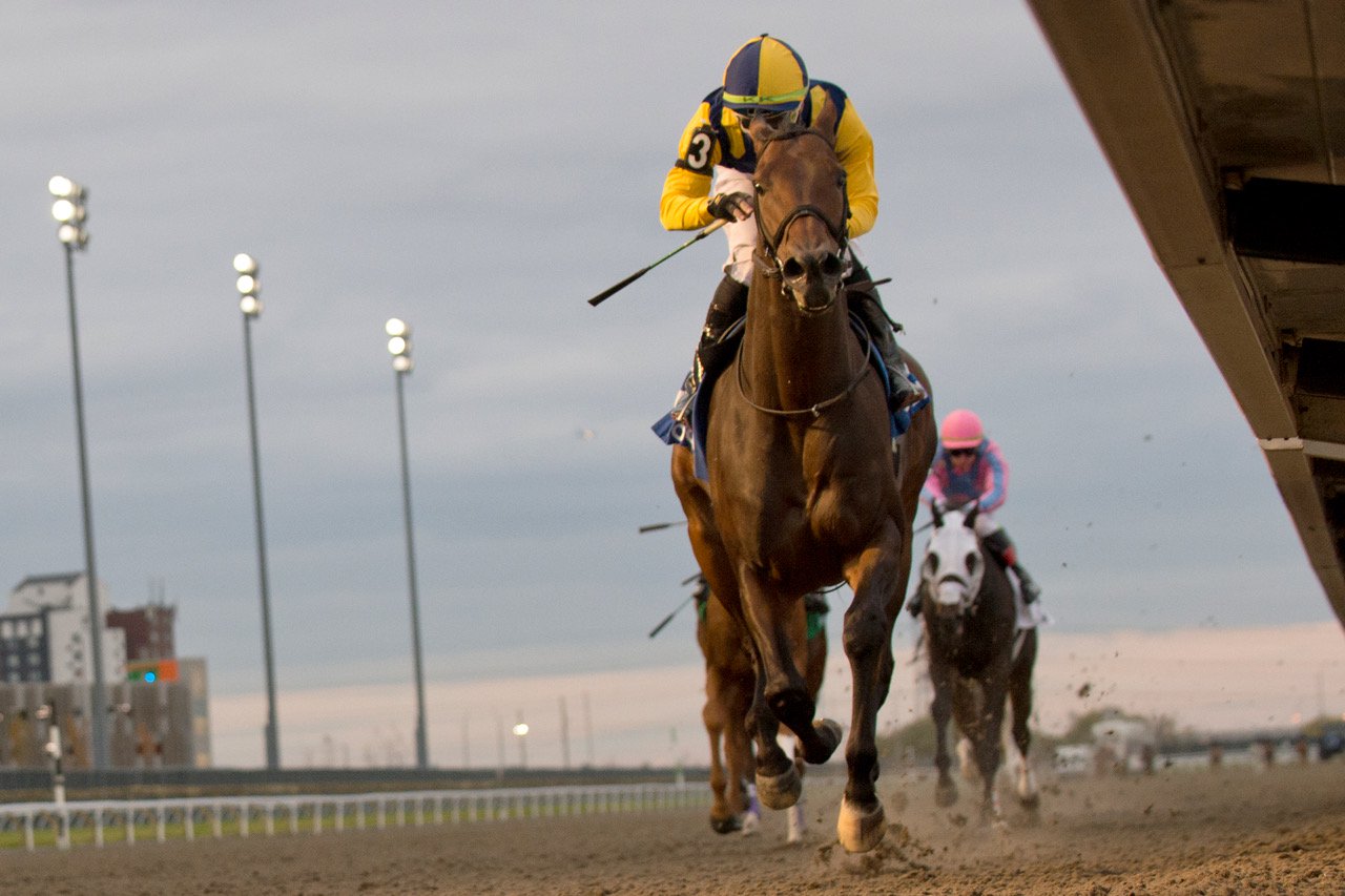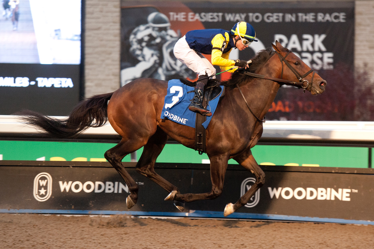 TORONTO, November 5, 2023 – Wolfie’s Dynaghost, a 5-year-old son of Ghostzapper-Dynaire, put on a frontrunning tour de force to win Sunday’s $175,000 Autumn Stakes (G2) at Woodbine. Trained by Jonathan Thomas for owner and breeder Woodslane Farm, the gelding arrived at the 1 1/16-mile main track race for 3-year-olds and up off a third in the Durham Cup (G3) at the Toronto oval on October 7. Supplemented to the Autumn, multiple graded stakes placed Wolfie’s Dynaghost earned his first graded triumph courtesy of a flawless performance on a cloudy, grey afternoon at Woodbine. Wolfie’s Dynaghost and jockey Kazushi Kimura winning the Autumn Stakes on November 5, 2023 at Woodbine (Michael Burns Photo) Sent on his way at 7-2 in the compact field of six, the bay, in rein to leading rider Kazushi Kimura, was engaged by multiple graded stakes victor War Bomber (IRE) and Win for the Money in the run to the first turn. Wolfie’s Dynaghost was a half-length clear of War Bomber through an opening panel timed in :24.71, followed by Win for the Money, 3-5 choice Tyson, Artie’s Storm, and Luckman. In front by a length through a half in :48.44, Wolfie’s Dynaghost, making his third appearance at Woodbine, remained unfettered on the front end in the leadup to the final turn, with little change in positioning throughout the field. Coming off the turn for home, Wolfie’s Dynaghost, still running comfortably on the lead, began to pull away from his pursuers and held a 2 ½-length advantage at the stretch call. From there, the only thing left to decide was second place, as Win for the Money and 40-1 Luckman dueled for the runner-up spot, with the former three-quarters of a length clear of his rival at the wire. The final time for the 4 ½-length victory was 1:42.52. Wolfie’s Dynaghost and jockey Kazushi Kimura winning the Autumn Stakes on November 5, 2023 at Woodbine (Michael Burns Photo) “I felt like he had a nice, high cruising pace, and I just kept him steady and just kept it going from the beginning,” said Kimura. “He was really relaxed on the backstretch and just took off from the three-eighths. It was a magnificent race.” It was the ninth lifetime win, accompanied by a pair of seconds and five thirds from 24 starts for the Kentucky-bred, whose travels have taken him to Florida, New York, Kentucky, Virginia, and Pennsylvania. Wolfie’s Dynaghost, the second choice in the betting, paid $9.70 for the win. Chris Lomon, Woodbine Communications / @WoodbineComms Share This:Share