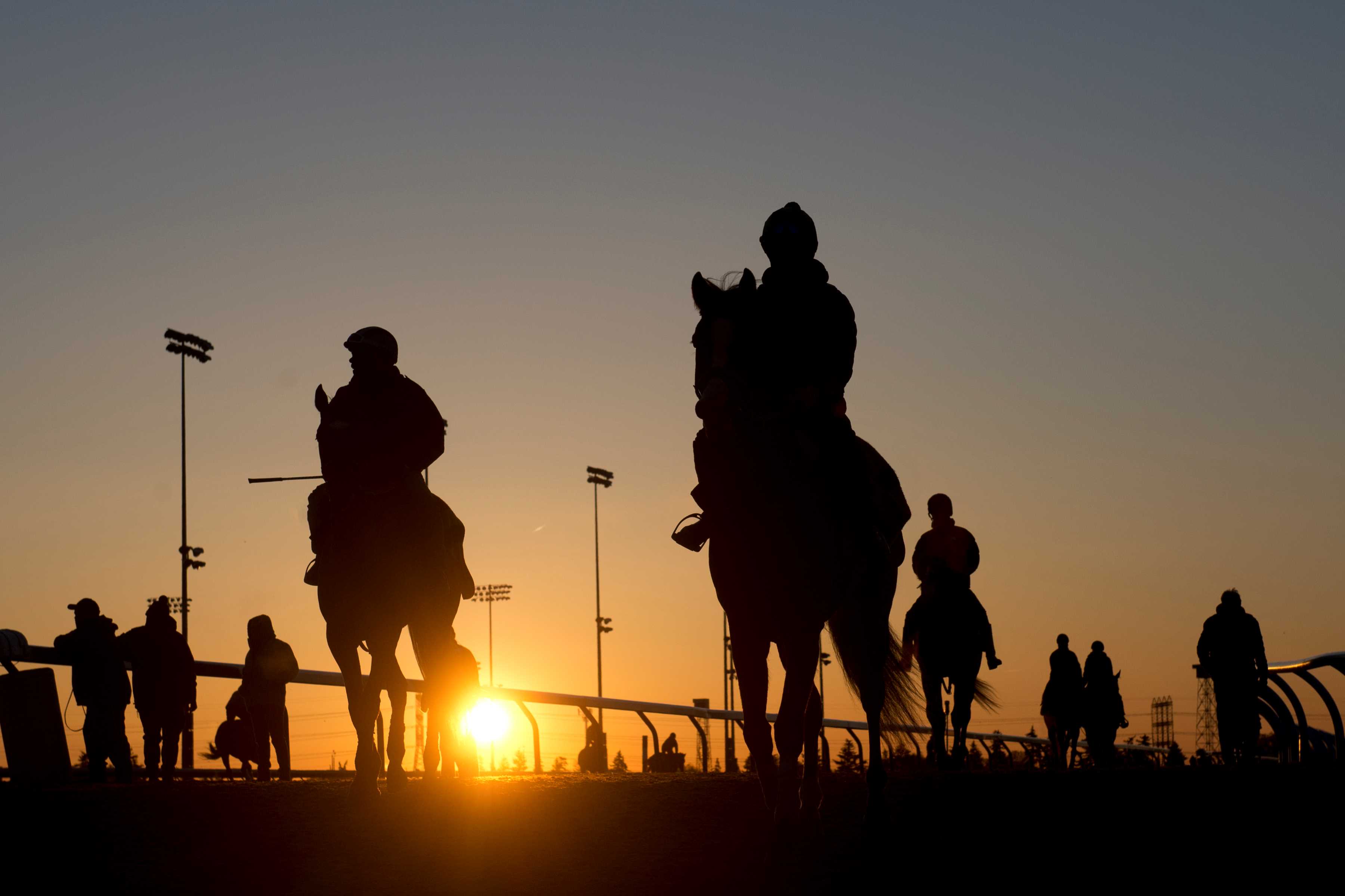 TORONTO, April 25, 2024 – Woodbine Entertainment is set to launch its 2024 Thoroughbred racing season this Saturday at Woodbine Racetrack in Toronto, Ontario. The 2024 season at Woodbine will consist of 129 race dates and runs through Sunday, December 15. The first two weeks of the meet will have racing held on Saturday and Sunday. Saturday’s opening day card will feature ten races and includes the $125,000 Star Shoot Stakes. Fans will want to arrive early on Saturday to receive a free Woodbine travel mug. Fans are entitled to one mug per person. Post time is 1:10 p.m. To view the entries for Saturday, click here. The new season is highlighted by the 165th running of The King’s Plate on Saturday, August 17. Turf Champions Day on Saturday, September 14 will have the eyes of the racing world on Woodbine, with four Grade One events on the card, including the Woodbine Mile. To view the entire 2024 stakes schedule, click here. Woodbine will add Fridays to the racing schedule on May 10 and then add Thursday twilight racing beginning May 23. Post time on Friday, Saturday and Sunday will be 1:10 p.m., while Thursday cards will begin at 4:50 p.m. Horseplayers can watch and wager on the entire 2024 season at Woodbine through HPIbet.com. Horse Racing is also now available on bet365. For the latest racing schedule, live video, wagering tools and news, visit Woodbine.com or follow @WoodbineTB and @WoodbineComms on Twitter. The sun rises during morning training at Woodbine Racetrack April 2024 (Michael Burns Photo) Share This:Share